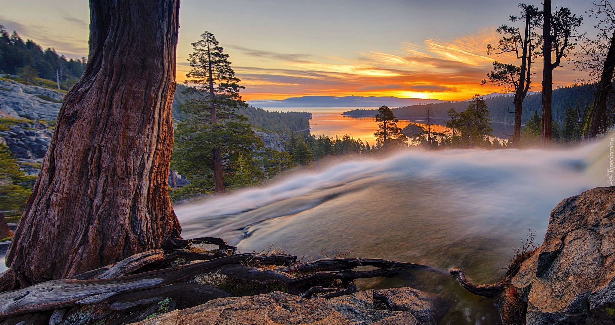 Edytor tapety: Góry, Jezioro, Mgła, Drzewa, Wschód Słońca