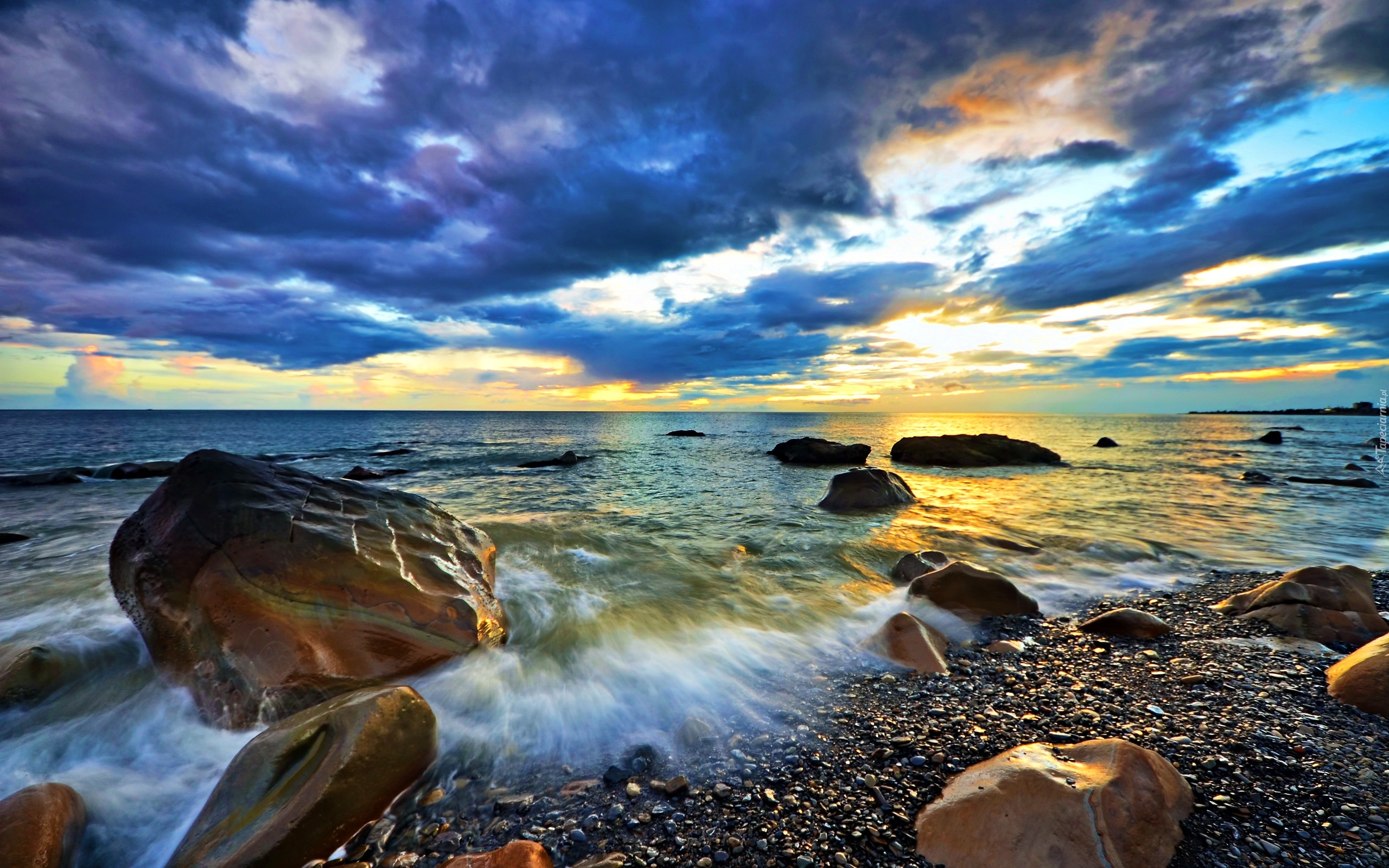 Edytor tapety: Kamienista, Plaża, Morze, Fale, Chmury