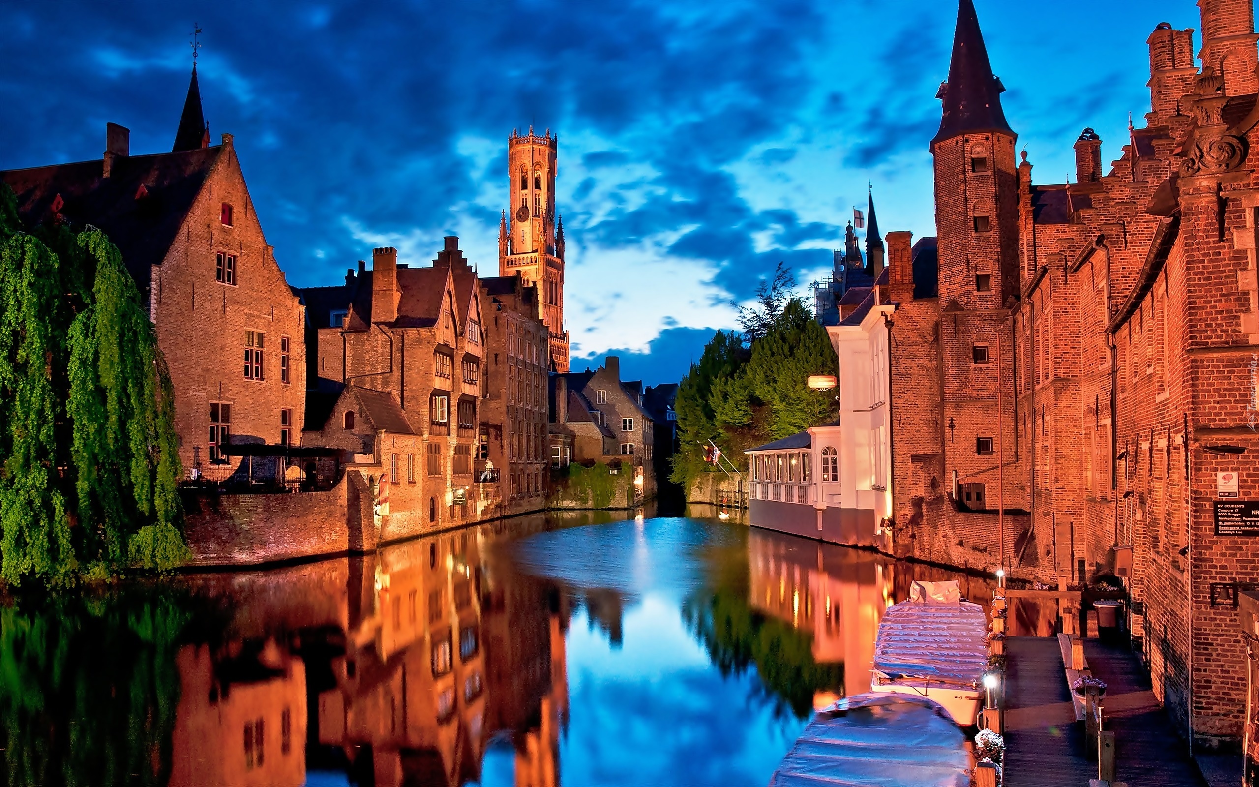 Edytor tapety: Miasto, Zmierzch, Budynki, Drzewa, Rzeka