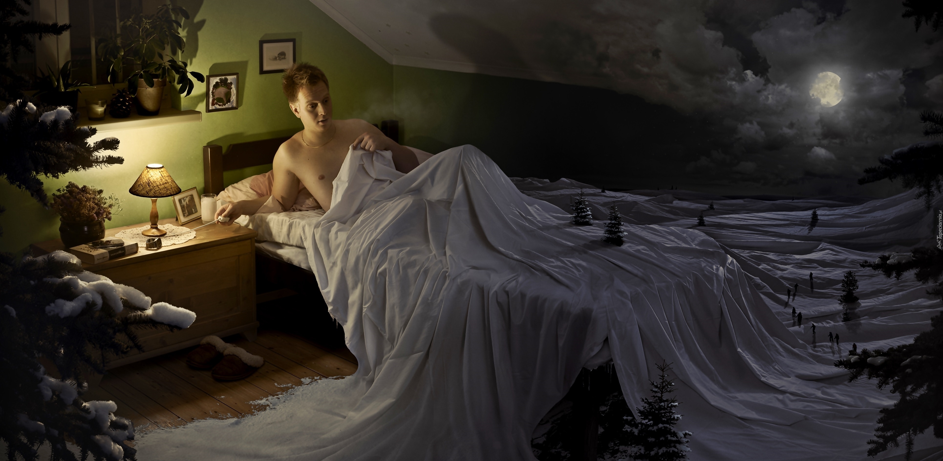 Edytor tapety: Pokój, Mężczyzna, Łóżko, Noc, Zima, Świerki