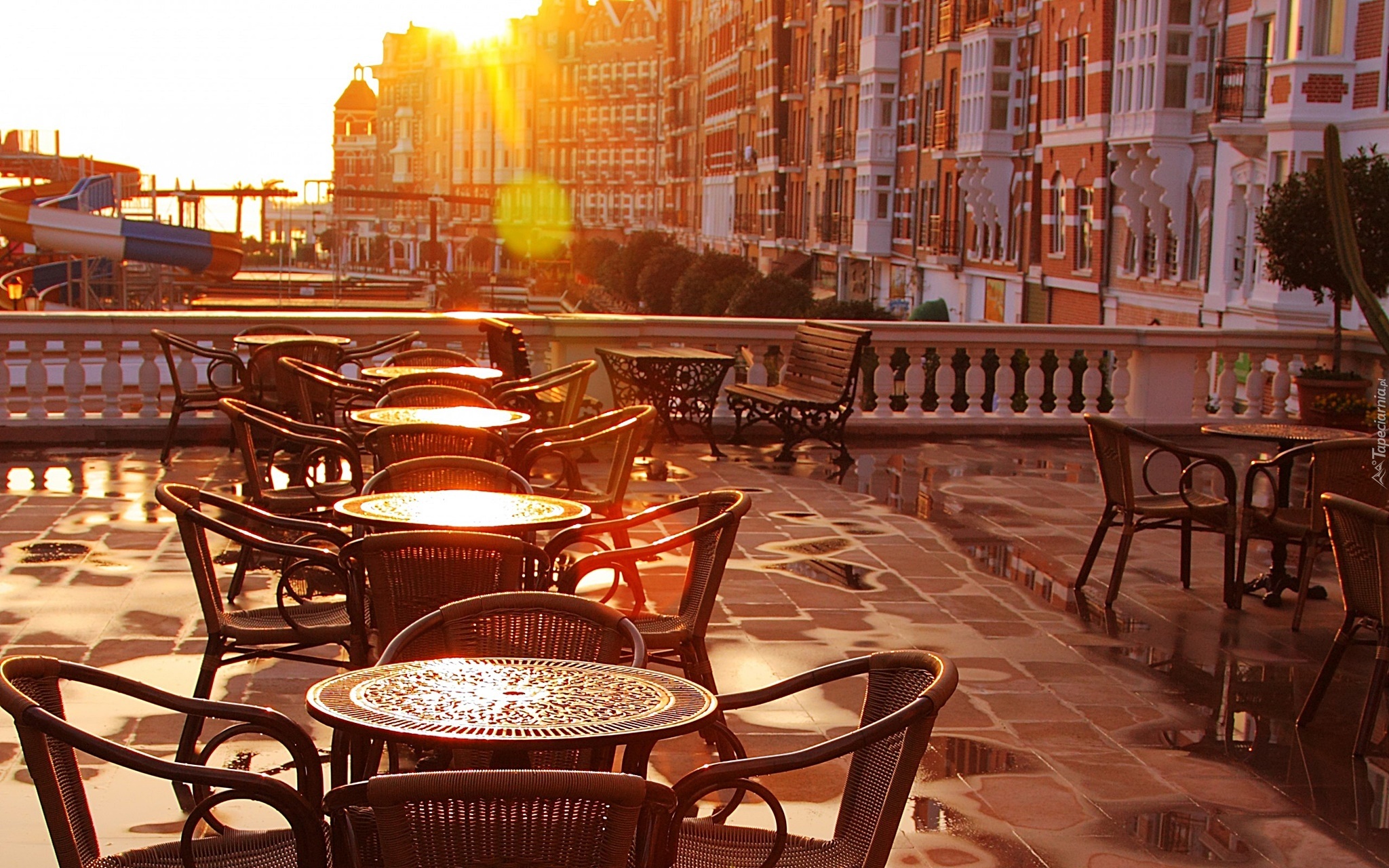 Edytor tapety: Restauracja, Taras, Zachód Słońca, Budynki