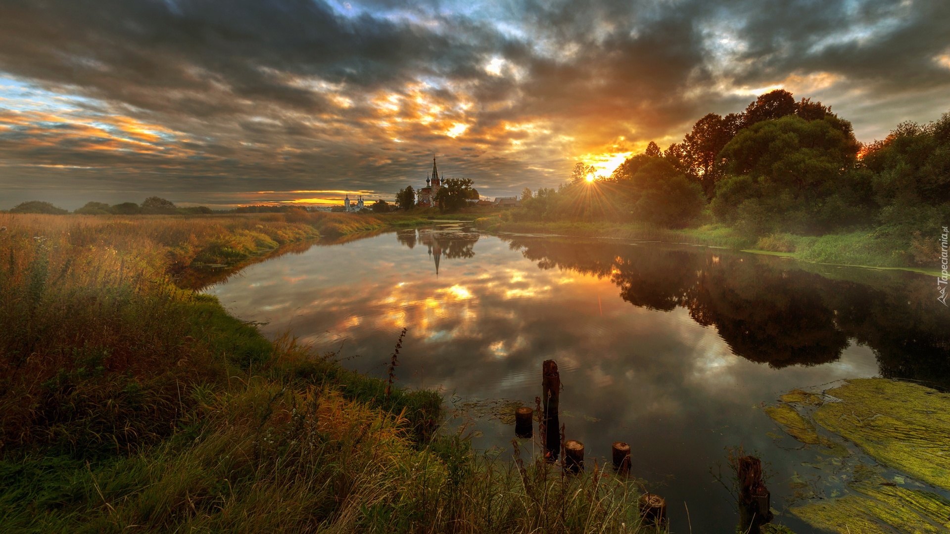 Edytor tapety: Rzeka, Chmury, Promienie, Słońca, Kościół
