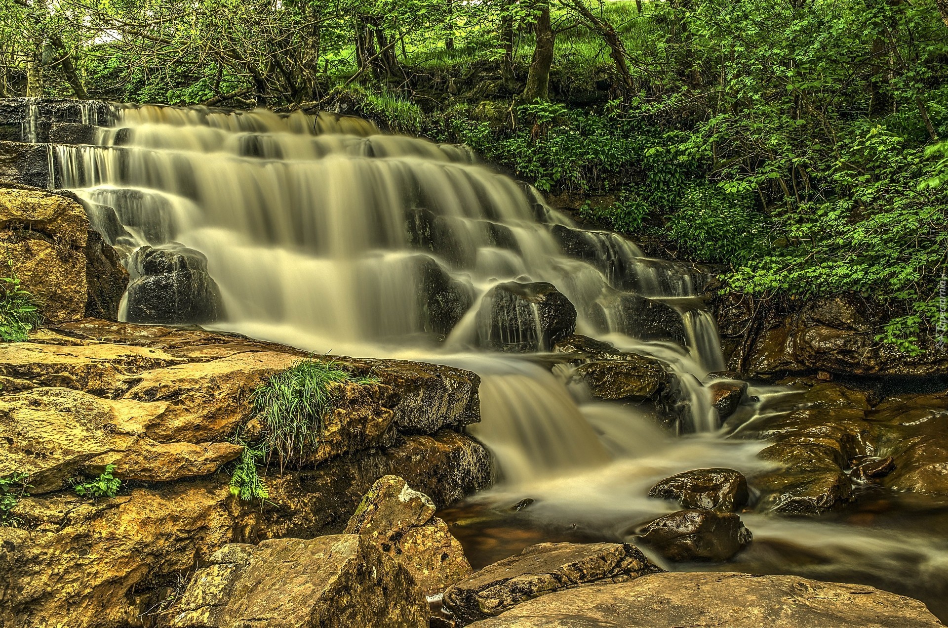 Edytor tapety: Wodospad, Skały, Drzewa