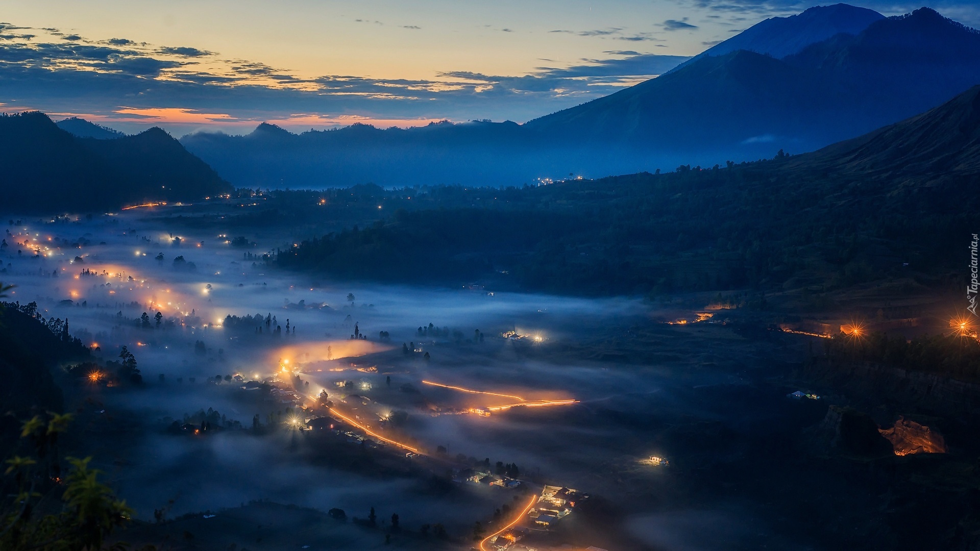 Edytor tapety: Miasteczko, Nocą, Góry, Mgła