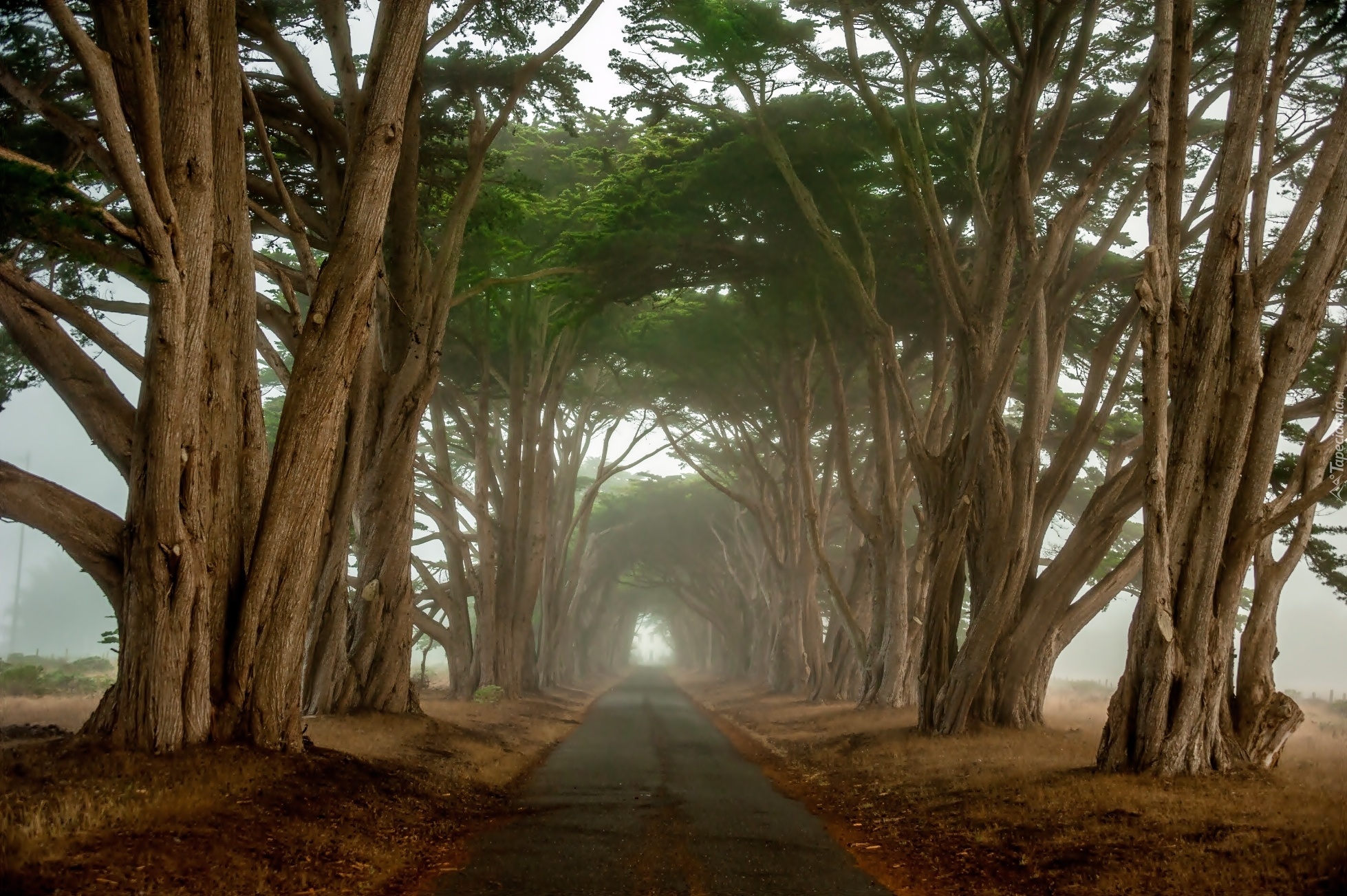 Edytor tapety: Droga, Mgła, Drzewa, Cyprys, Kalifornia