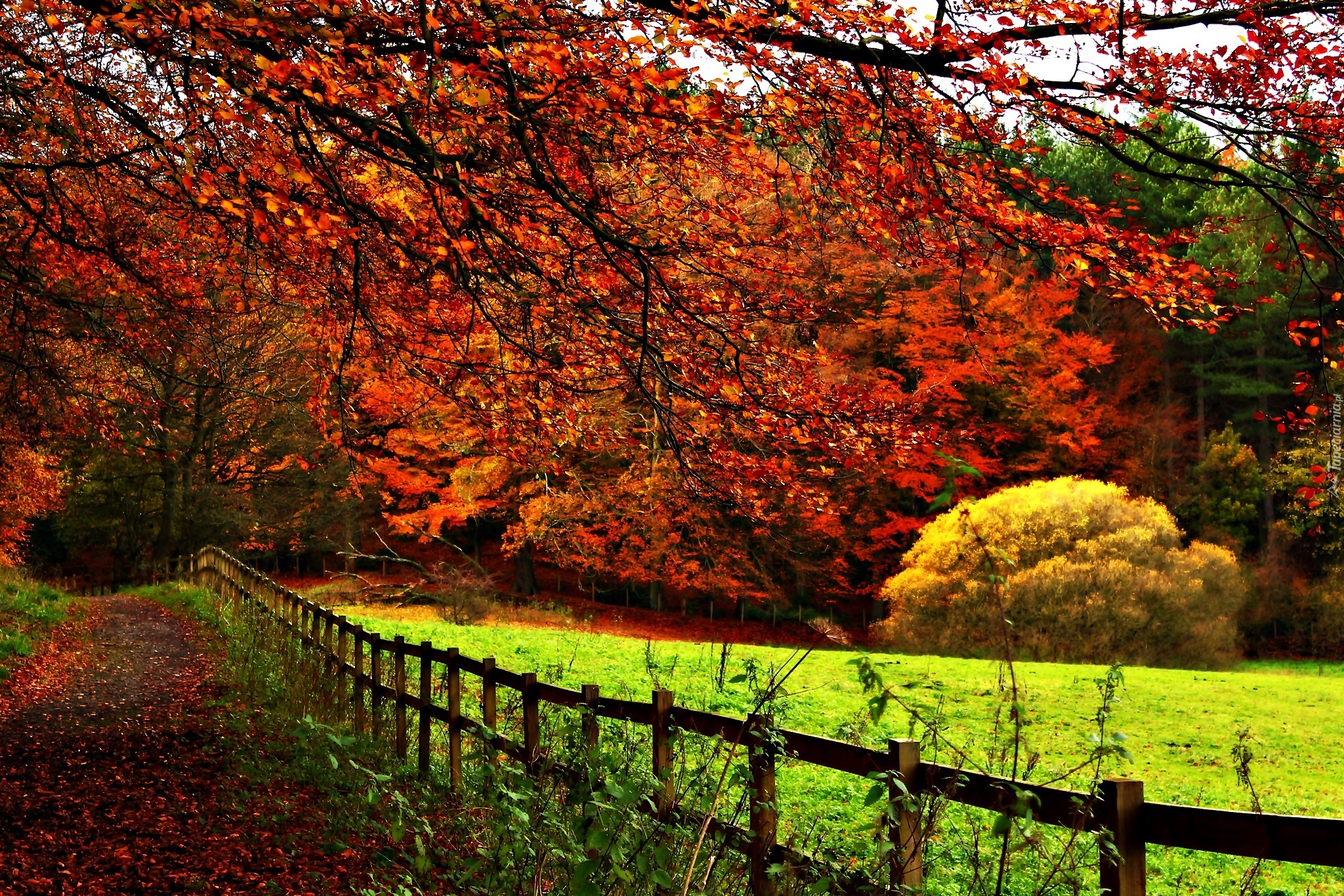 Edytor tapety: Jesień, Droga, Ogrodzenie, Las