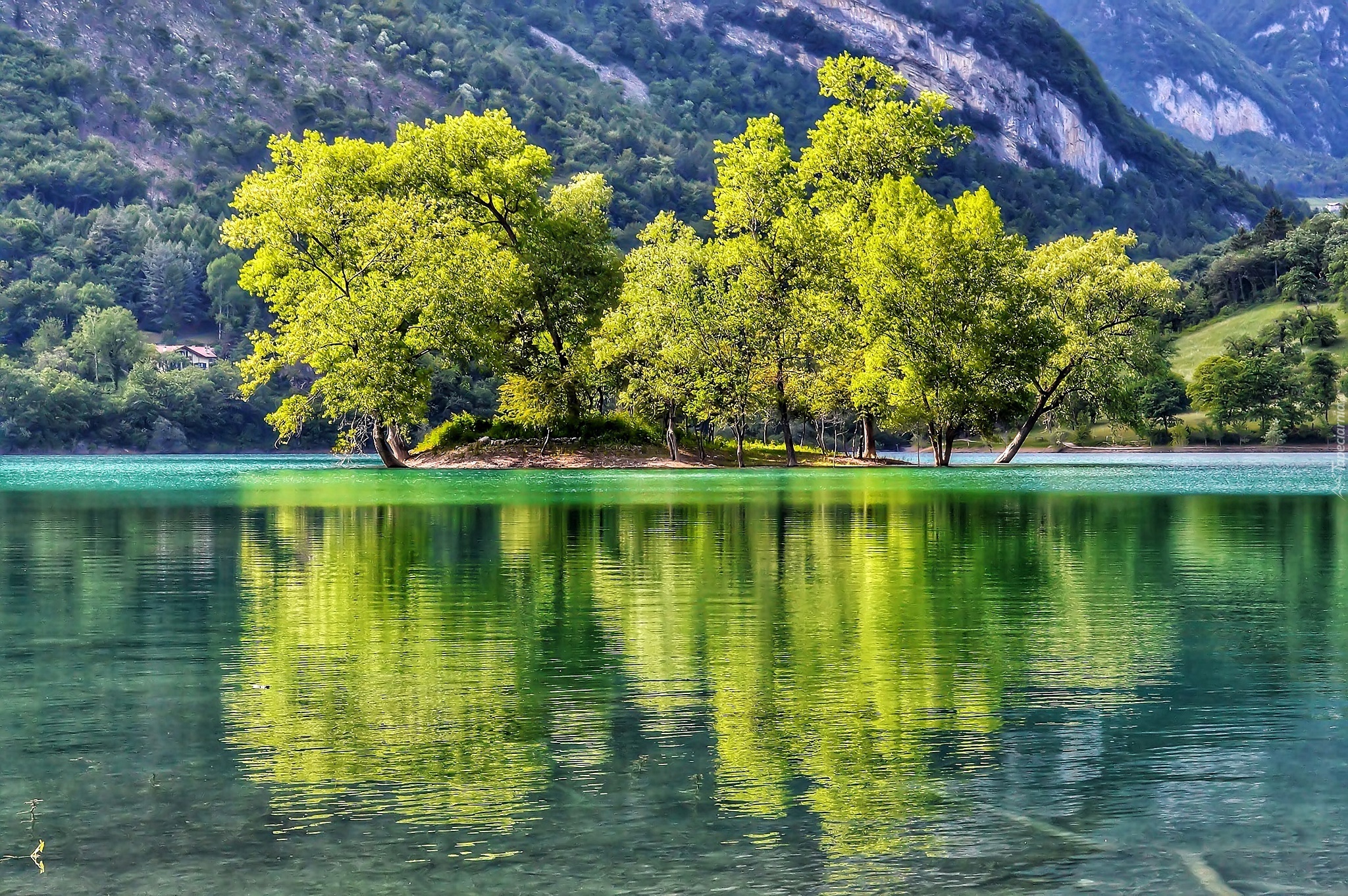 Edytor tapety: Jezioro, Wyspa, Drzewa, Góry, Lato