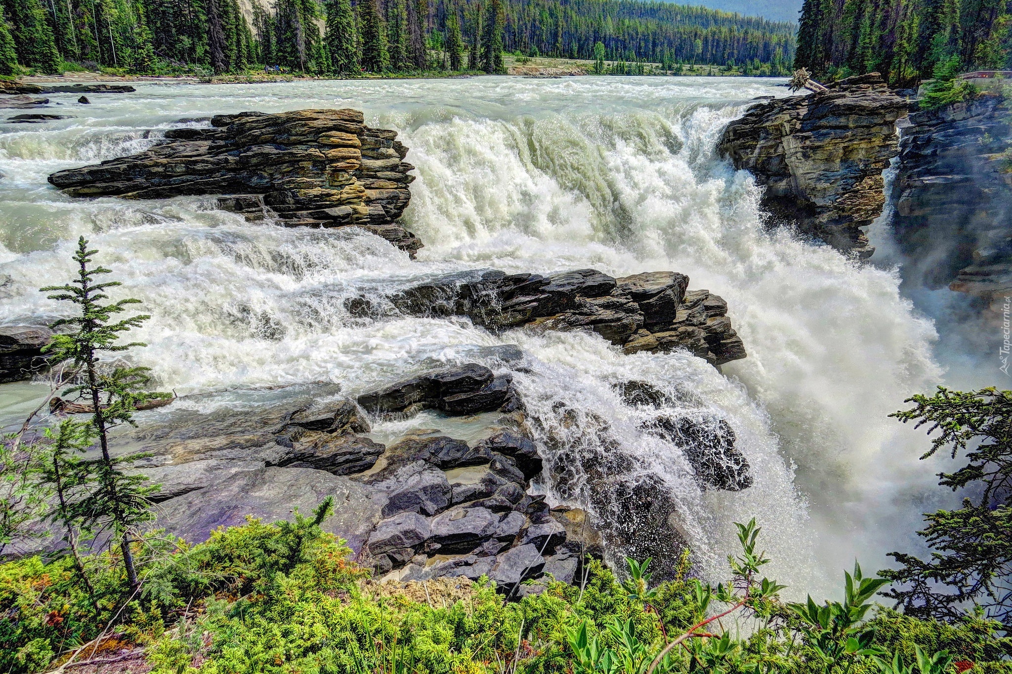 Edytor tapety: Rzeka, Wodospad, Las, Iglasty