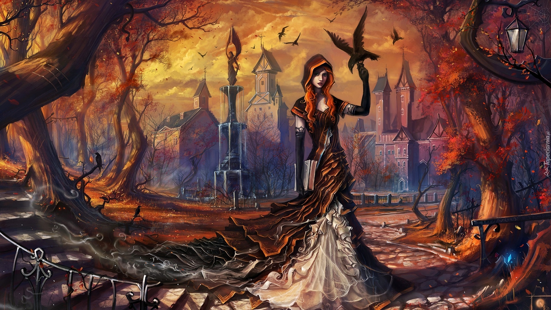 Edytor tapety: Fantasy, Dziewczyna, Kruk, Drzewa, Domy