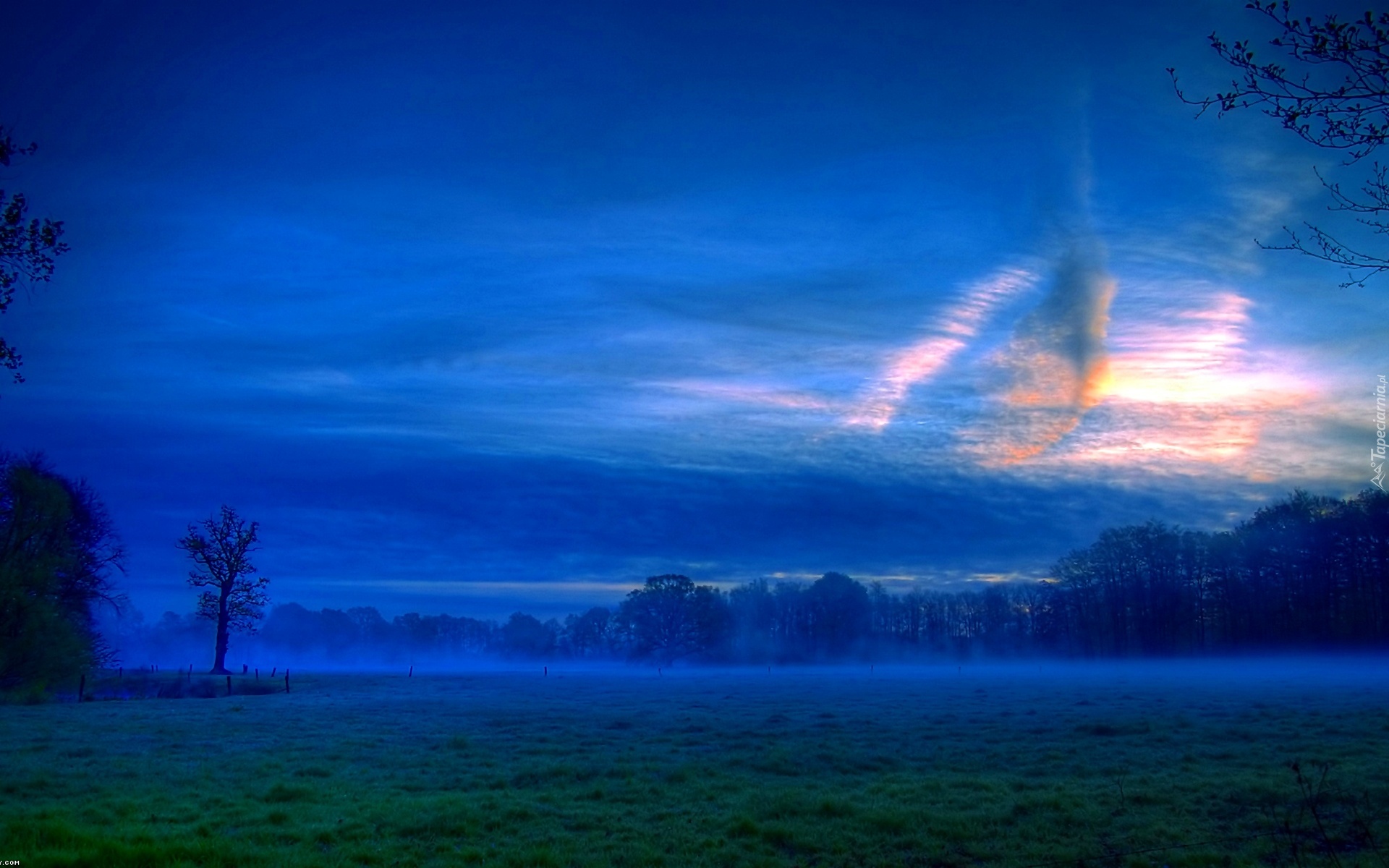 Edytor tapety: Wschód, Słońca, Poranek, Mgła, Łąka