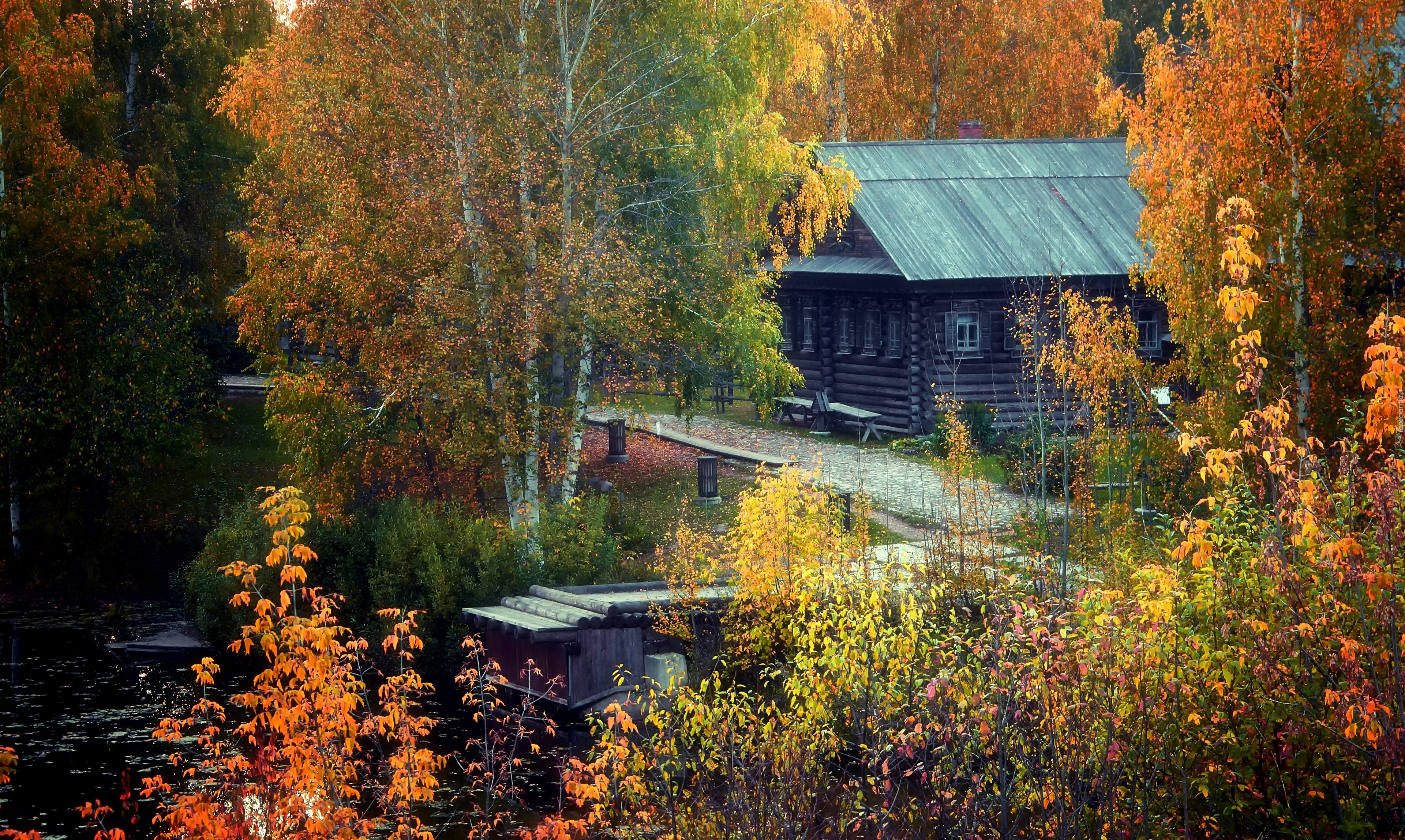 Edytor tapety: Jesień, Dom, Rzeczka, Drzewa