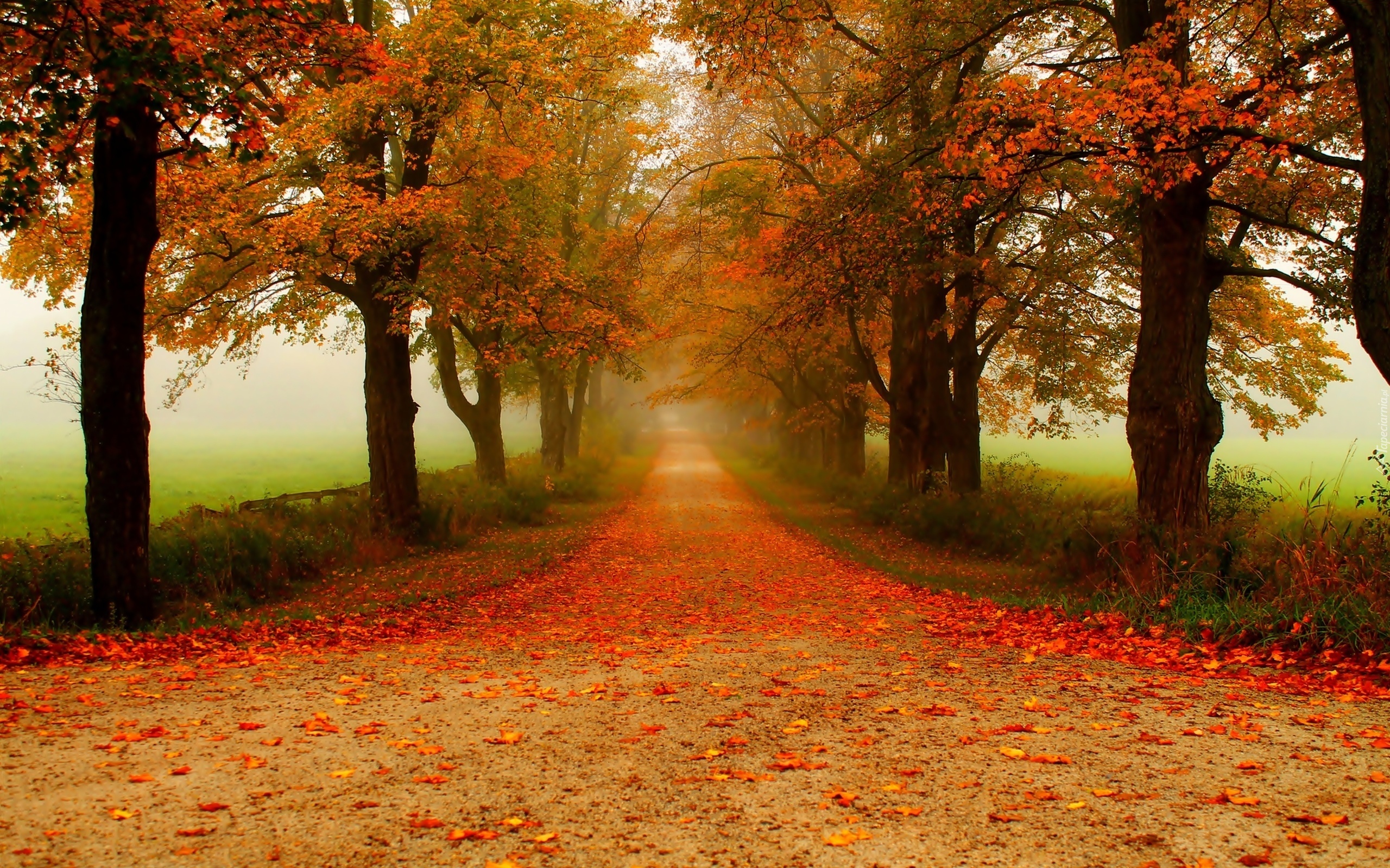Edytor tapety: Droga, Drzewa, Mgła, Liście, Poranek, Jesień