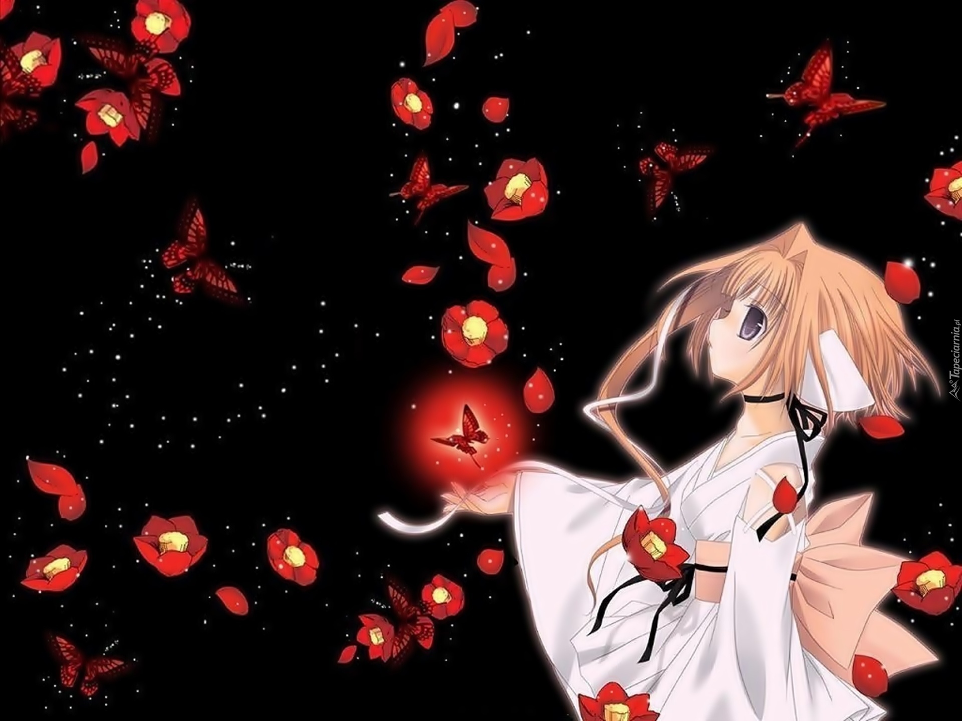 Edytor tapety: Manga Anime, Dziewczyna, Kwiaty, Motyle, Noc