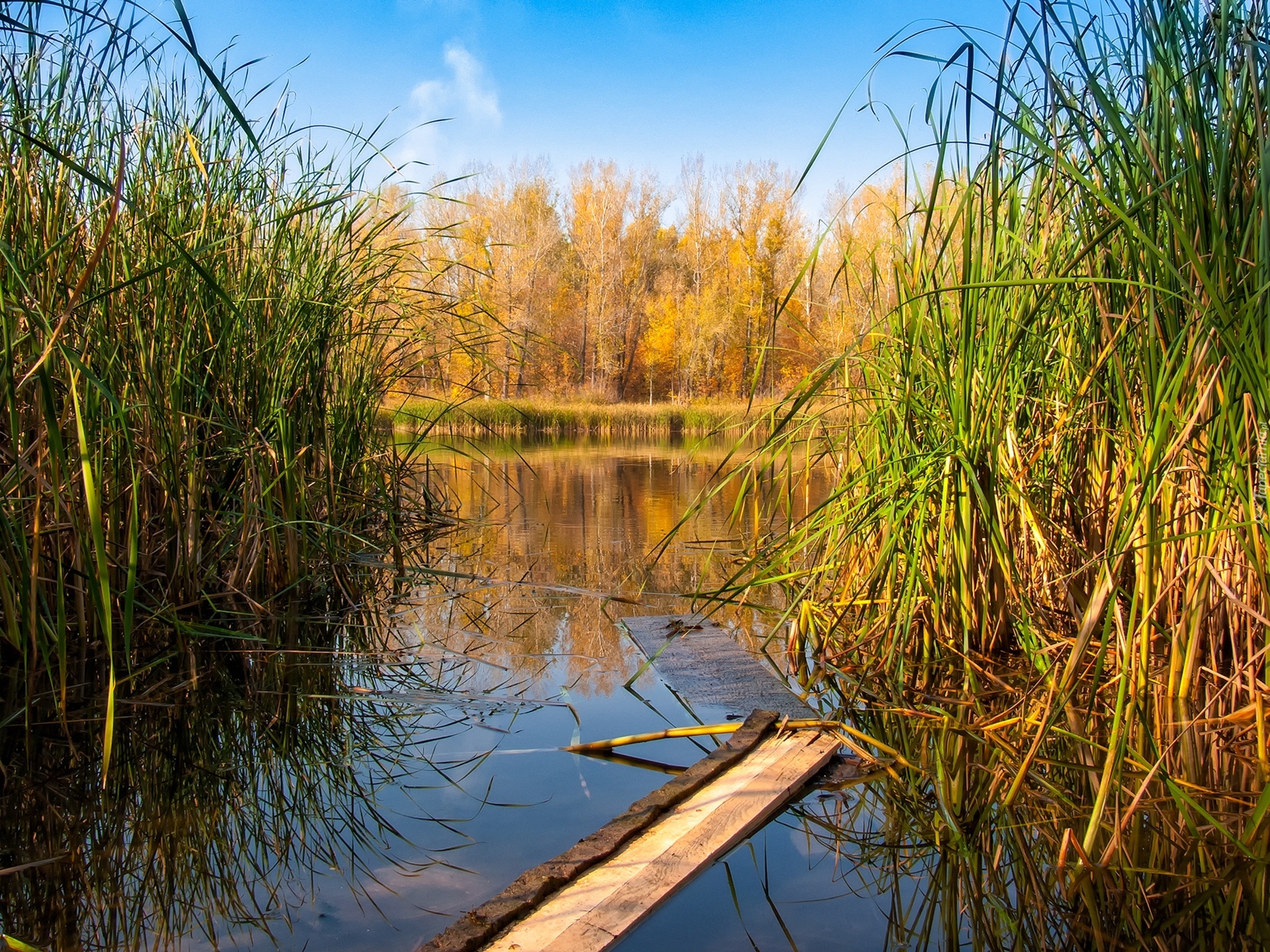 Edytor tapety: Jesień, Drzewa, Trzcina, Staw