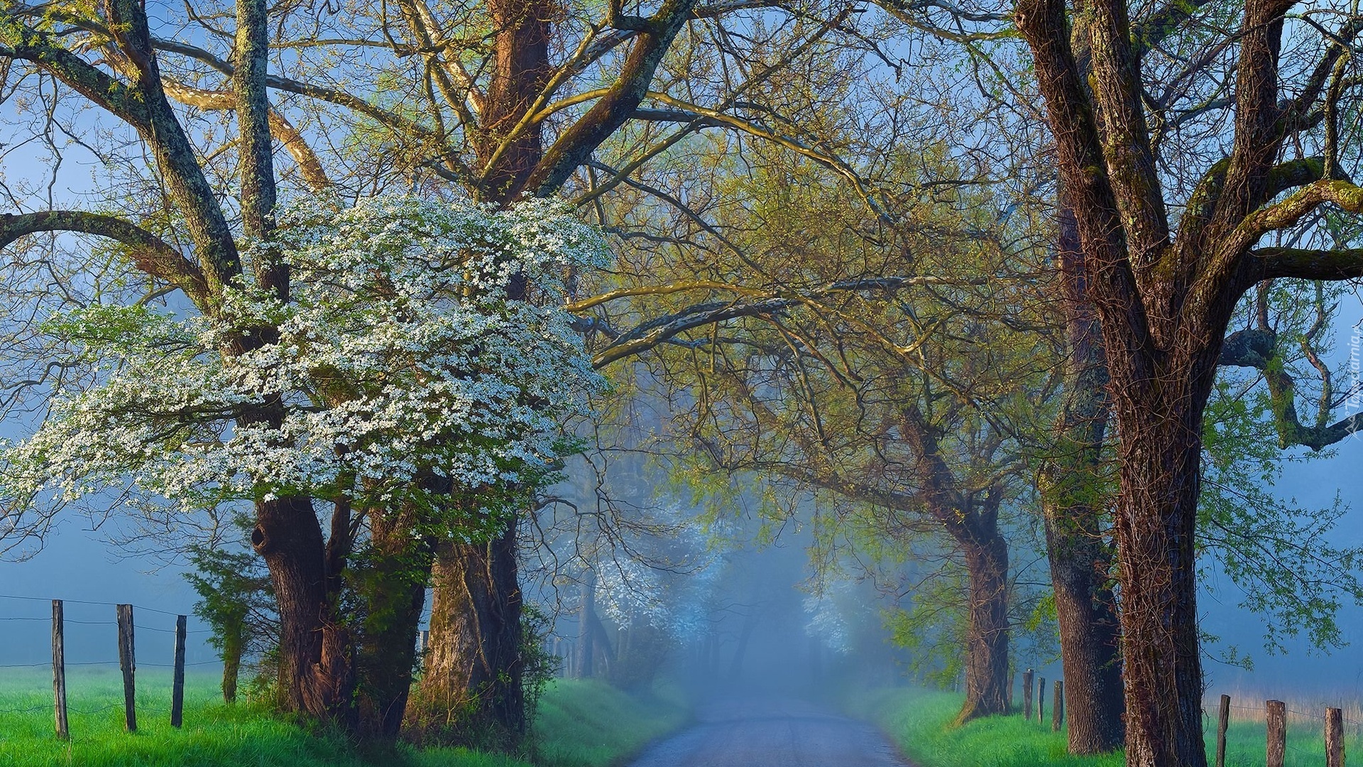 Edytor tapety: Świt, Droga, Drzewa, Mgła
