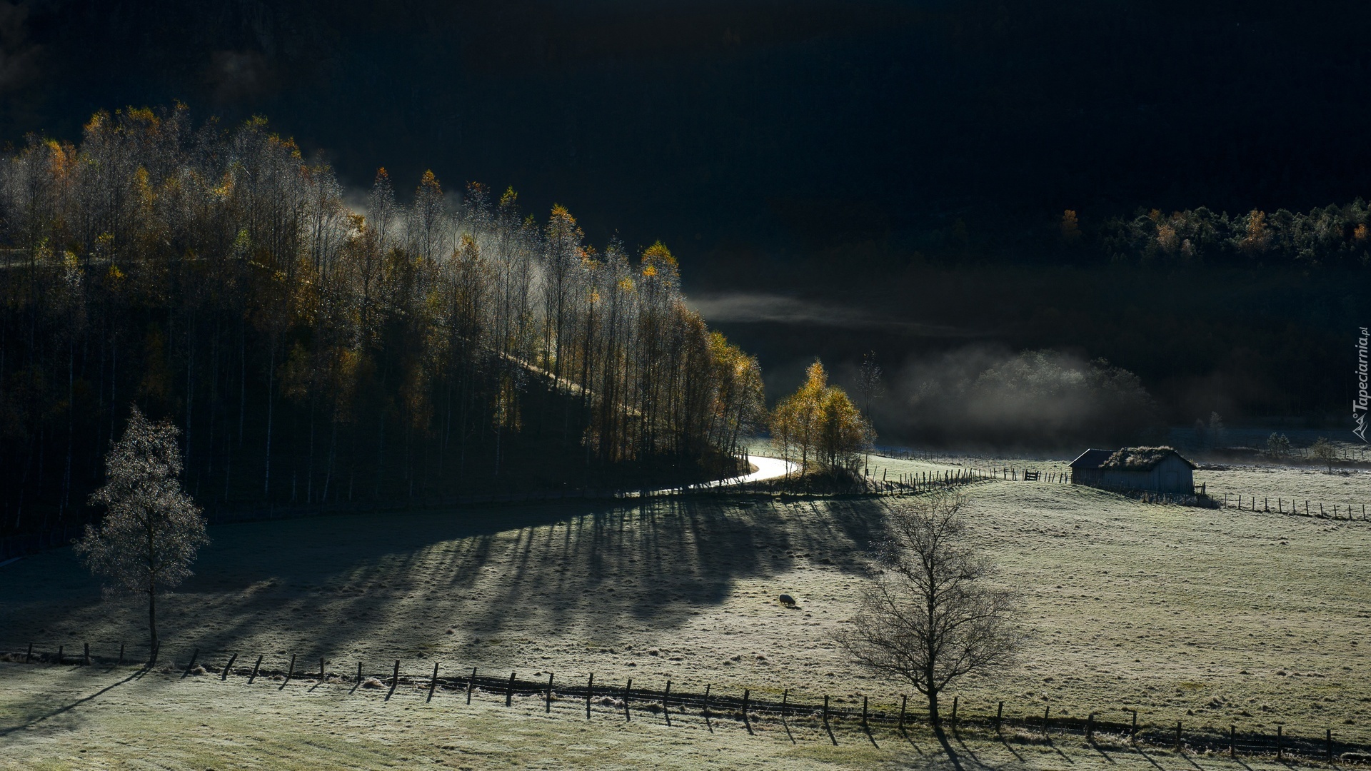 Edytor tapety: Świt, Poranek, Pola, Las, Domki