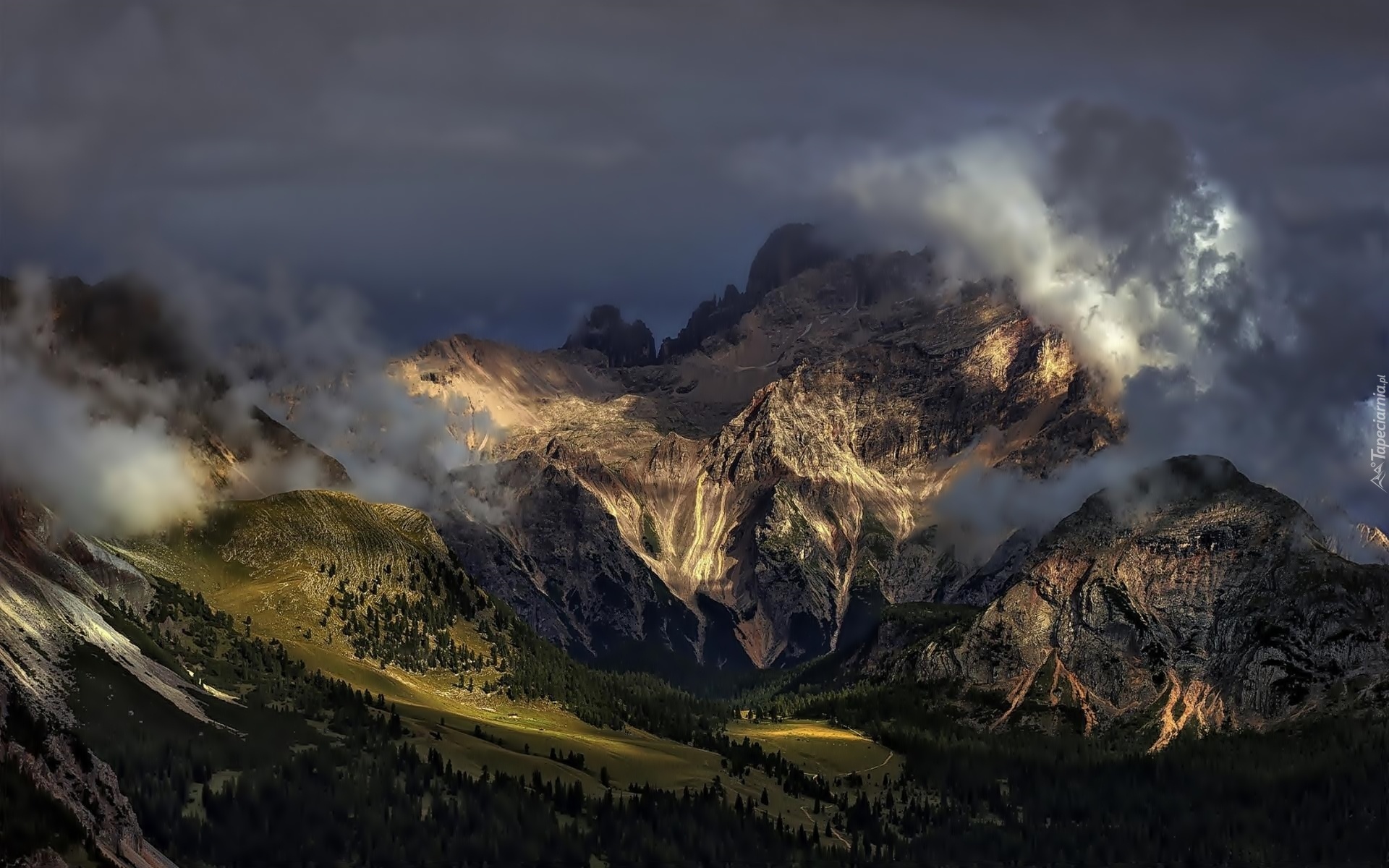 Edytor tapety: Góry, Łąki, Lasy, Chmury, Słońce, Na, Szczytach