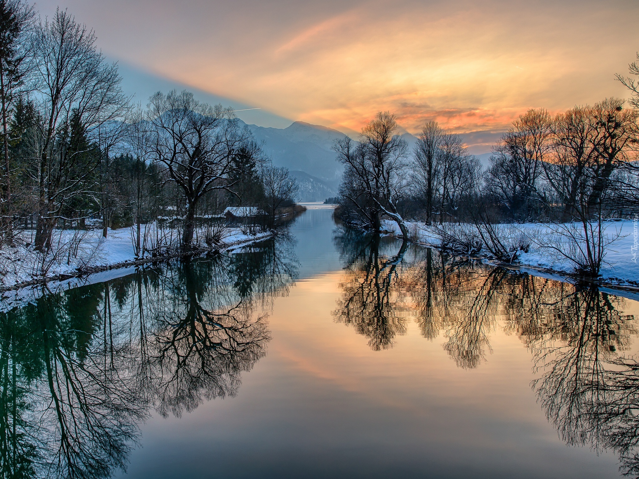 Edytor tapety: Rzeka, Drzewa, Domy, Góry, Lasy, Zima