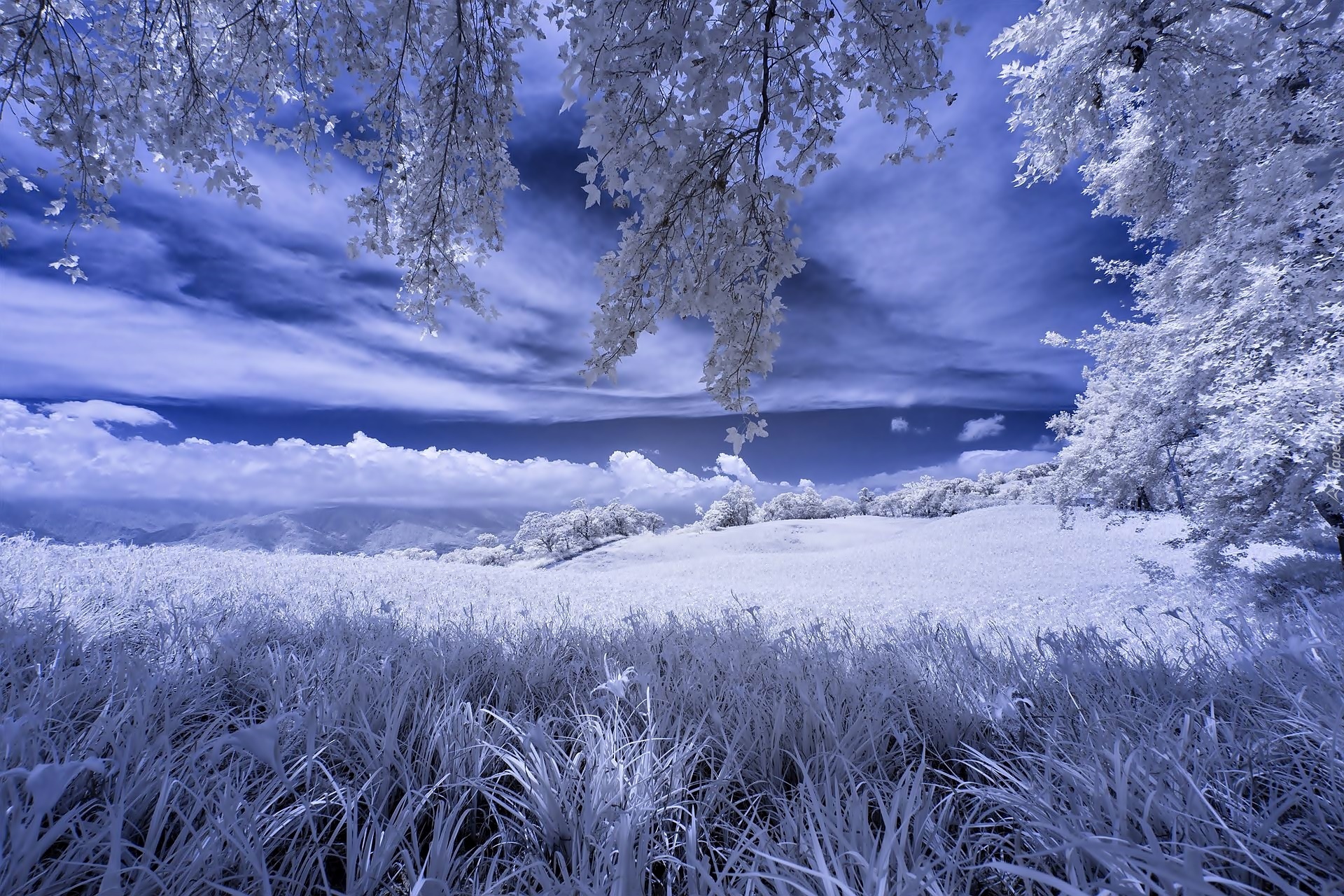 Edytor tapety: Oszronione, Trawy, Drzewa, Wzgórza, Chmury, Zima