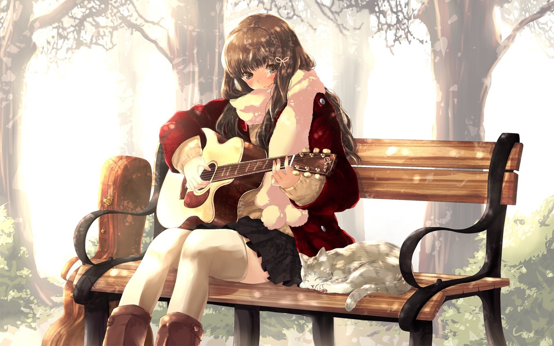 Edytor tapety: Dziewczyna, Z, Gitarą, Ławka, Kot, Zima