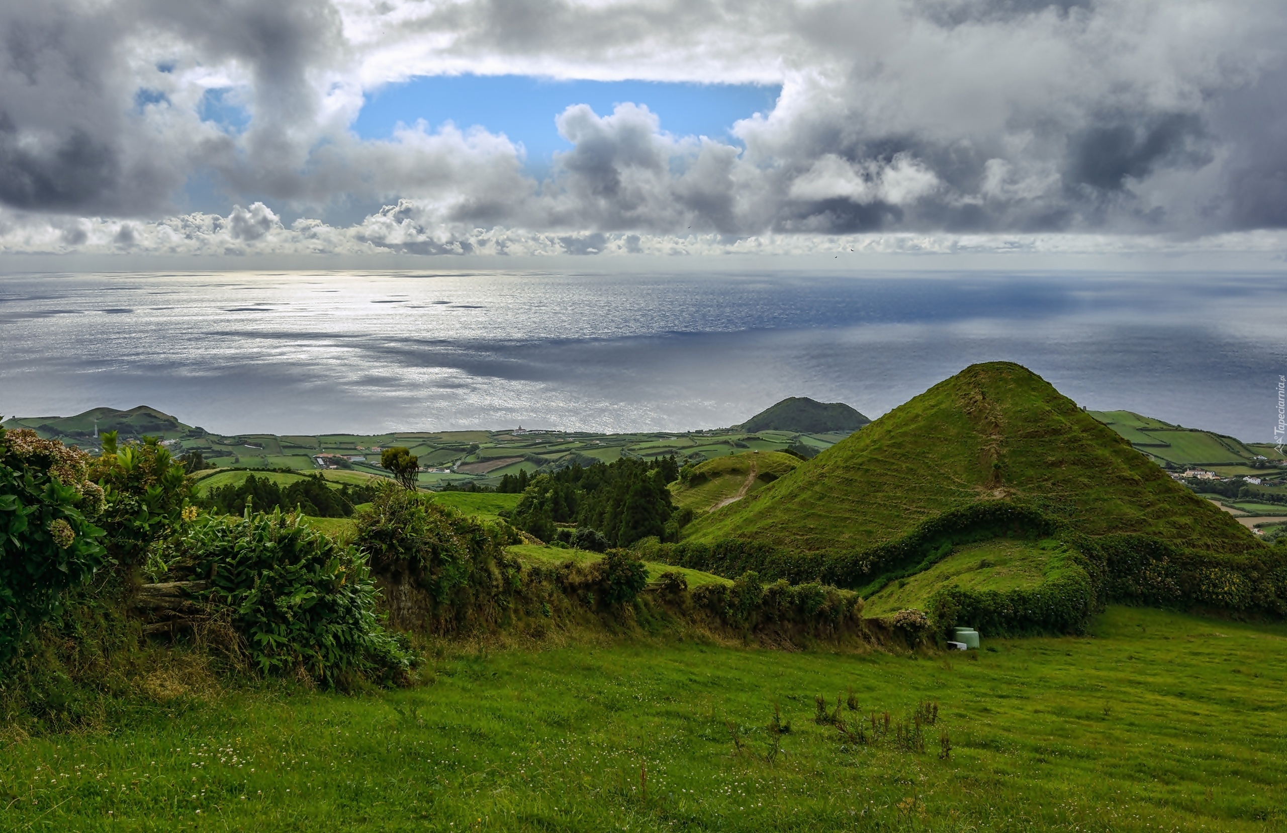 Edytor tapety: Morze, Chmury, Wzgórza