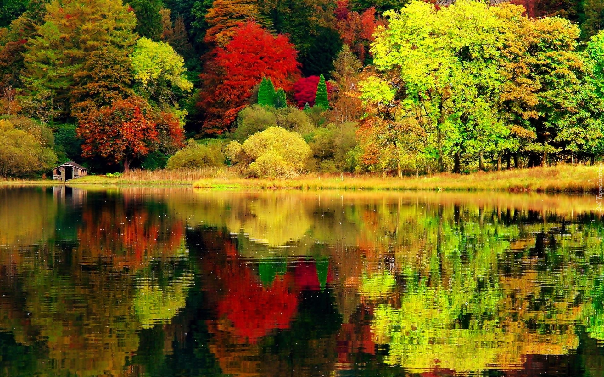 Edytor tapety: Jezioro, Las, Kolorowe, Drzewa, Domek, Jesień