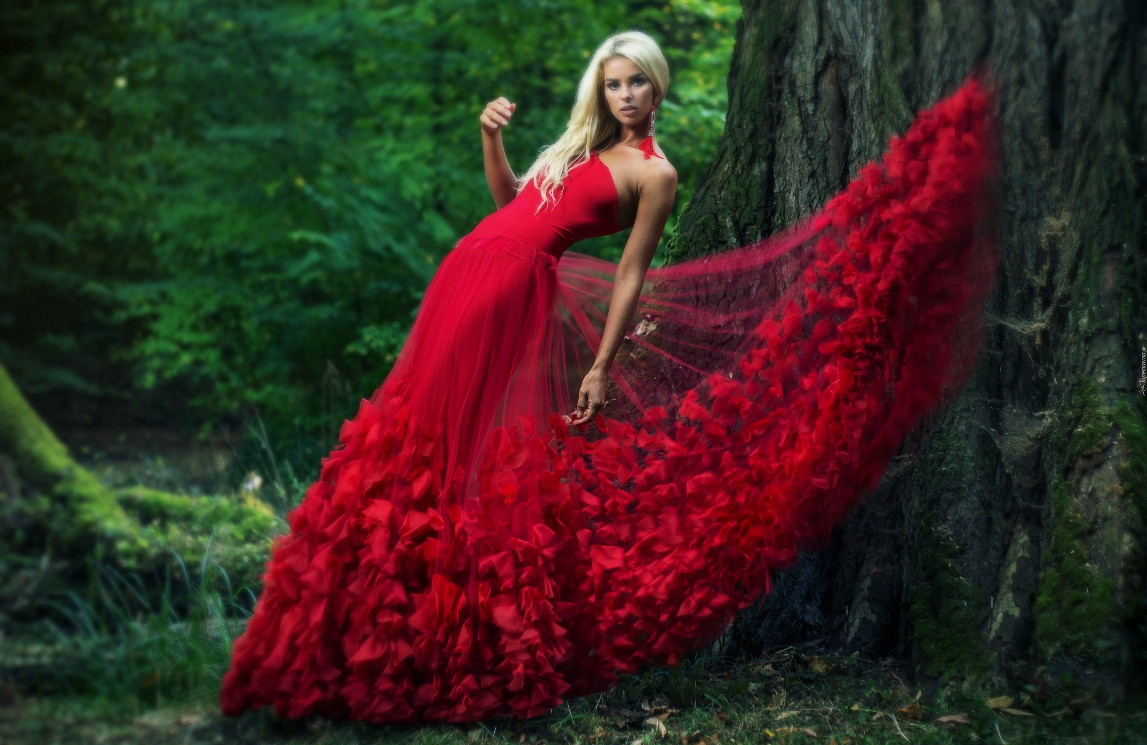 Edytor tapety: Kobieta, Modelka,Poza,Czerwona, Sukienka, Las, Drzewo