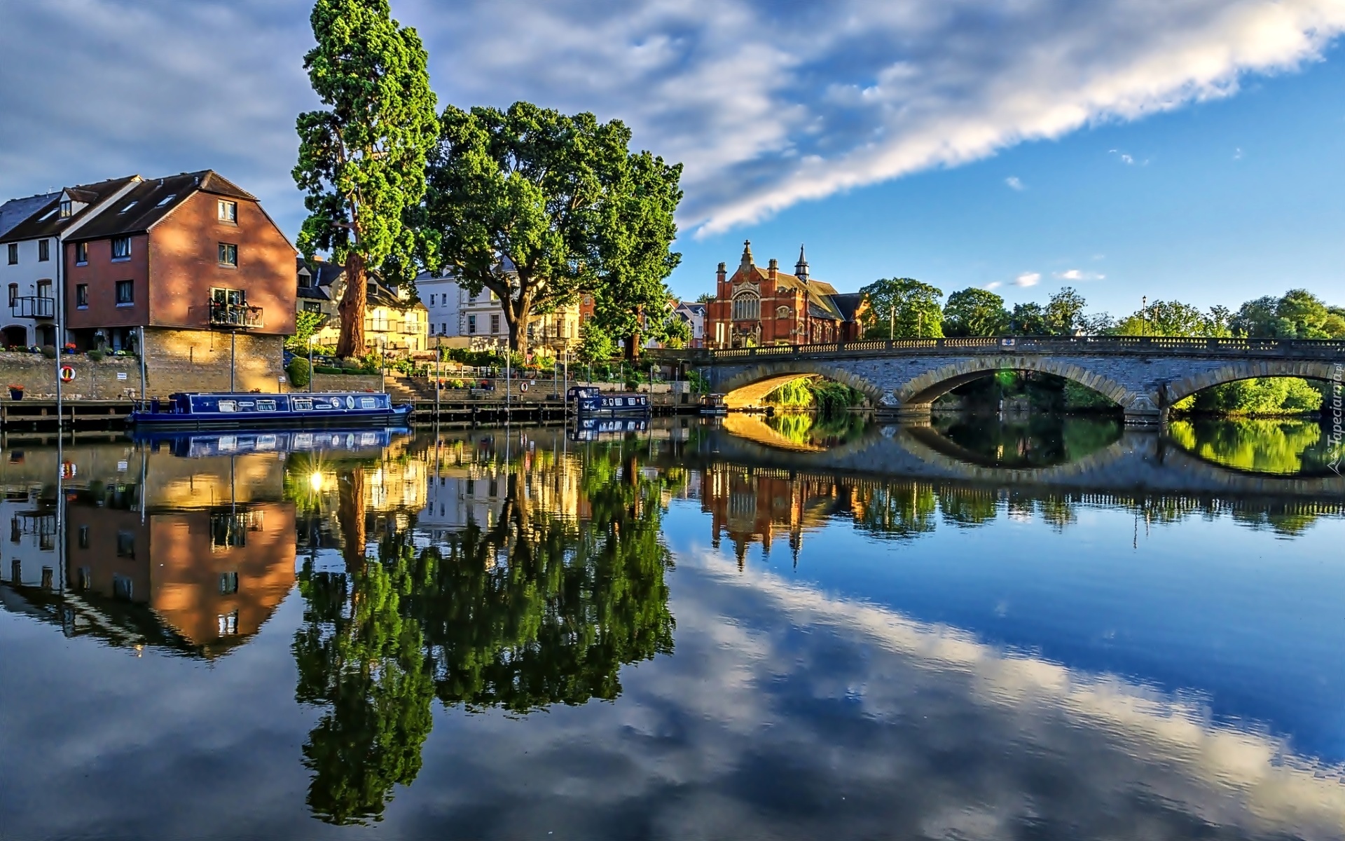 Edytor tapety: Rzeka, Most, Drzewa, Domy, Odbicie, Zdjęcie miasta