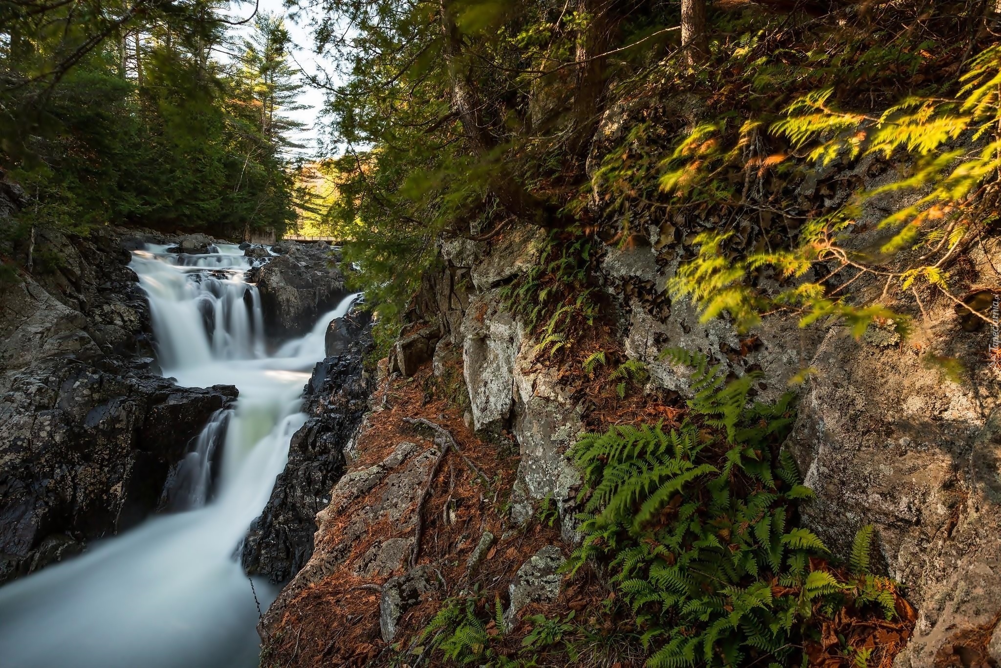 Edytor tapety: Wodospad, Las, Rzeka, Skały, Paprocie