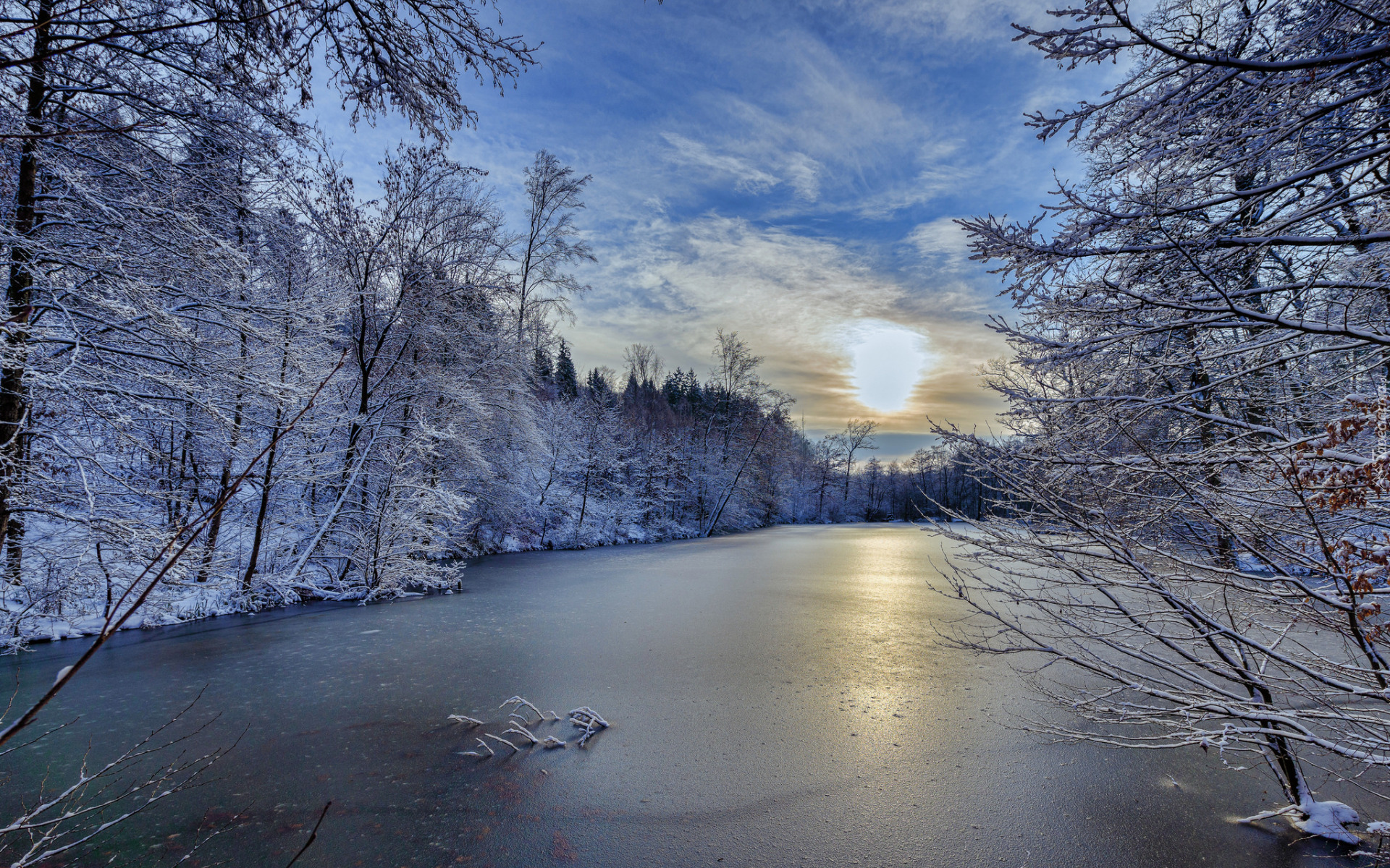 Edytor tapety: Zima, Rzeka, Las, Wschód, Słońca