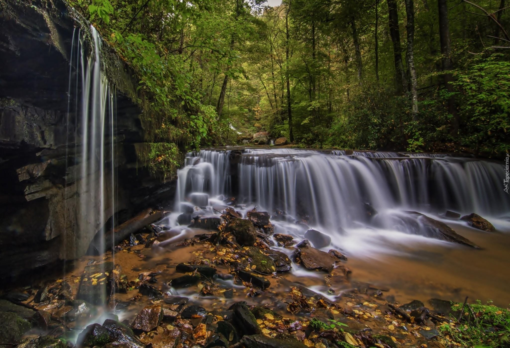 Edytor tapety: Wodospad, Las, Skały, Kamienie, Liście, Jesień