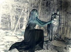 Edytor tapety: Kobieta, Suknia, Las, Kamienie, Wilk