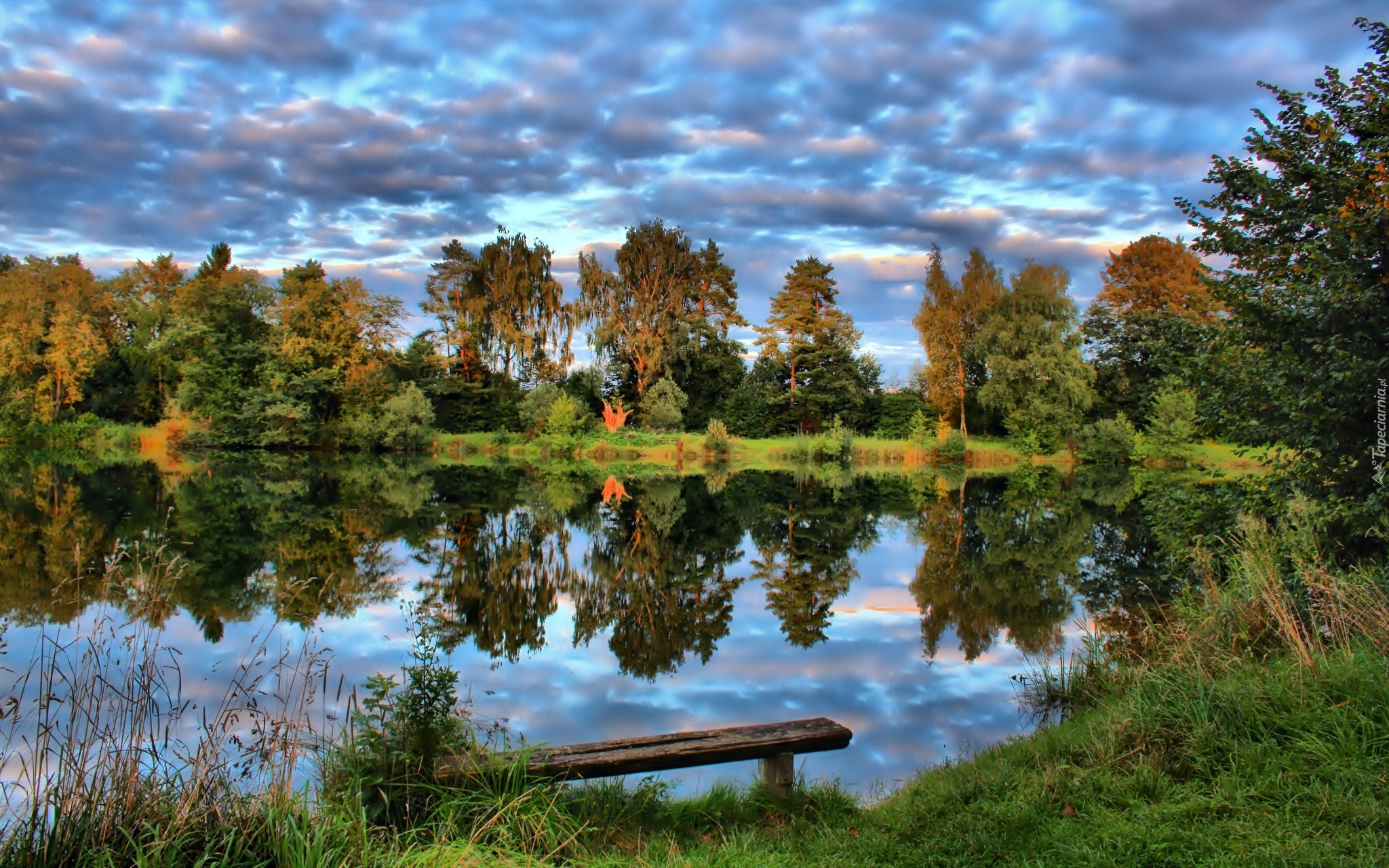 Edytor tapety: Las, Jezioro, Chmury, Ławka