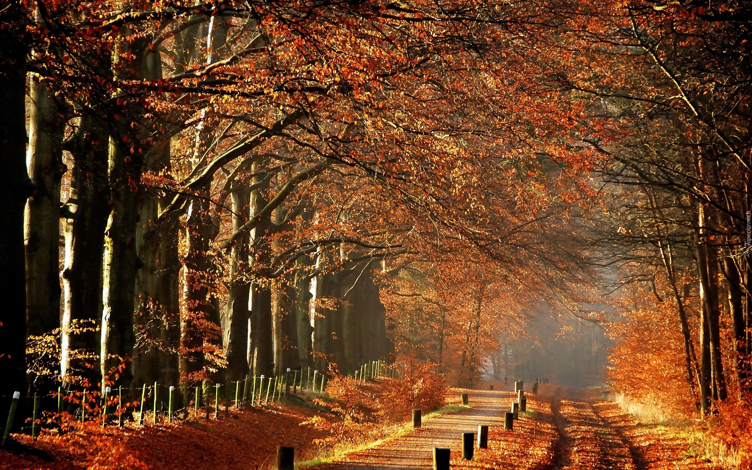 Edytor tapety: Park, Droga, Drzewa, Mgła, Jesień