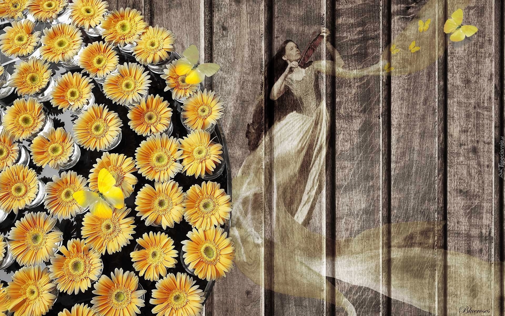 Edytor tapety: Grafika, Kobieta, Motyle, Kwiaty, Gerbery