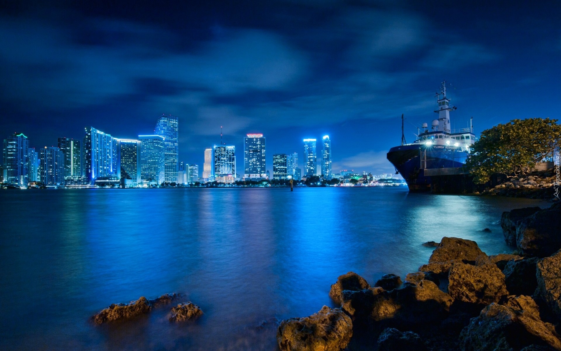 Edytor tapety: Statek, Wieżowce, Miasto nocą