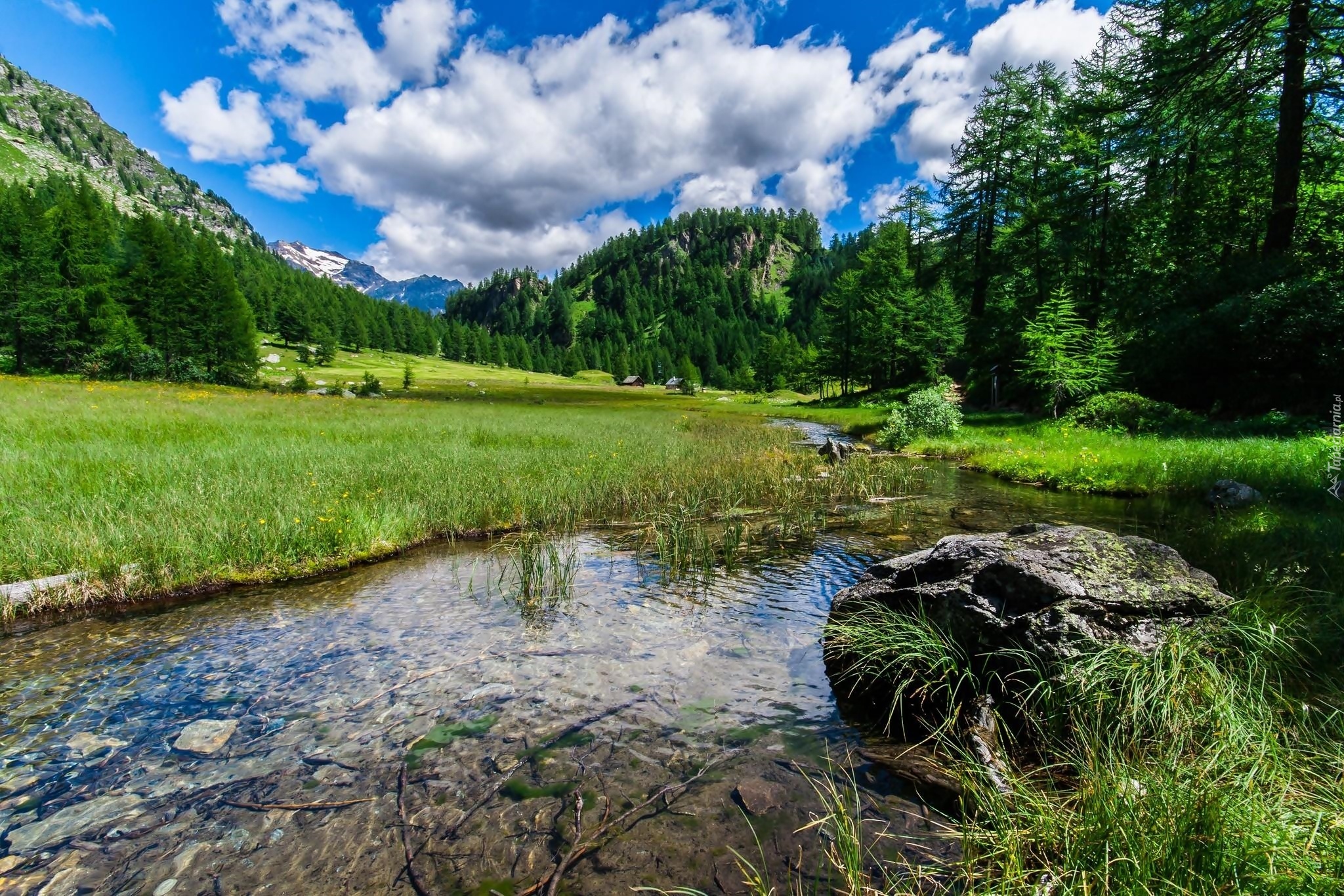 Edytor tapety: Góry, Lasy, Domy, Strumyk, Kamień, Łąka, Lato
