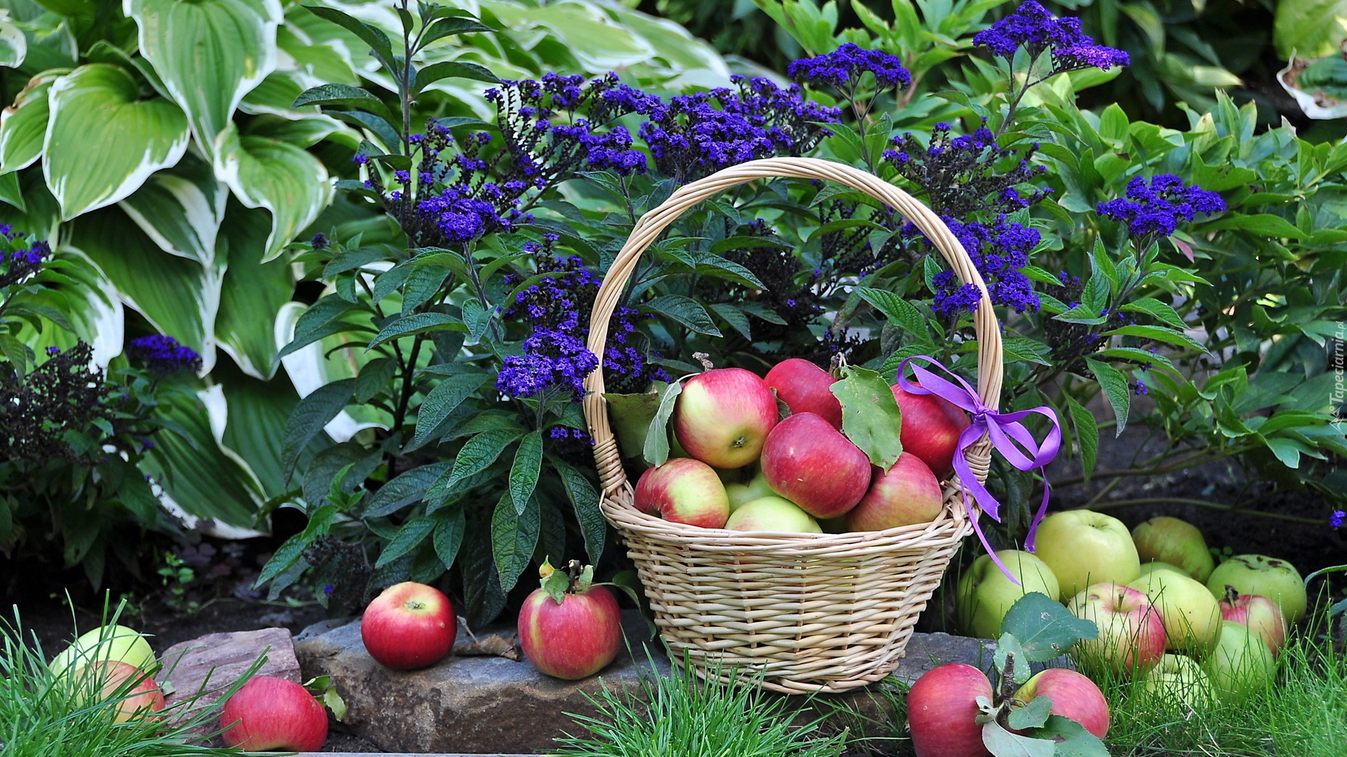 Edytor tapety: Kosz, Jabłek, Kamienie, Kwiaty, Sad