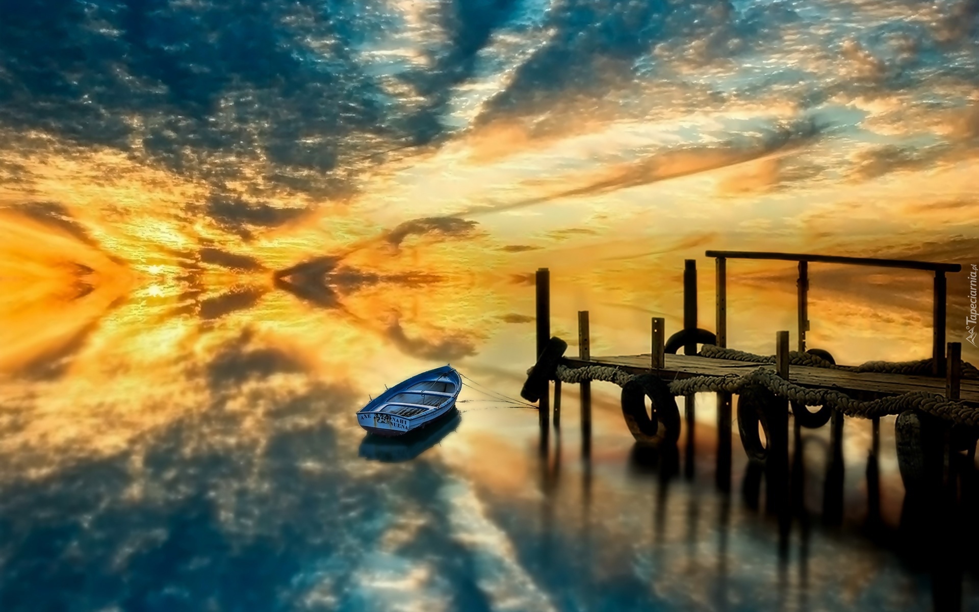 Edytor tapety: Jezioro, Łódka, Pomost, Zachód, Słońca