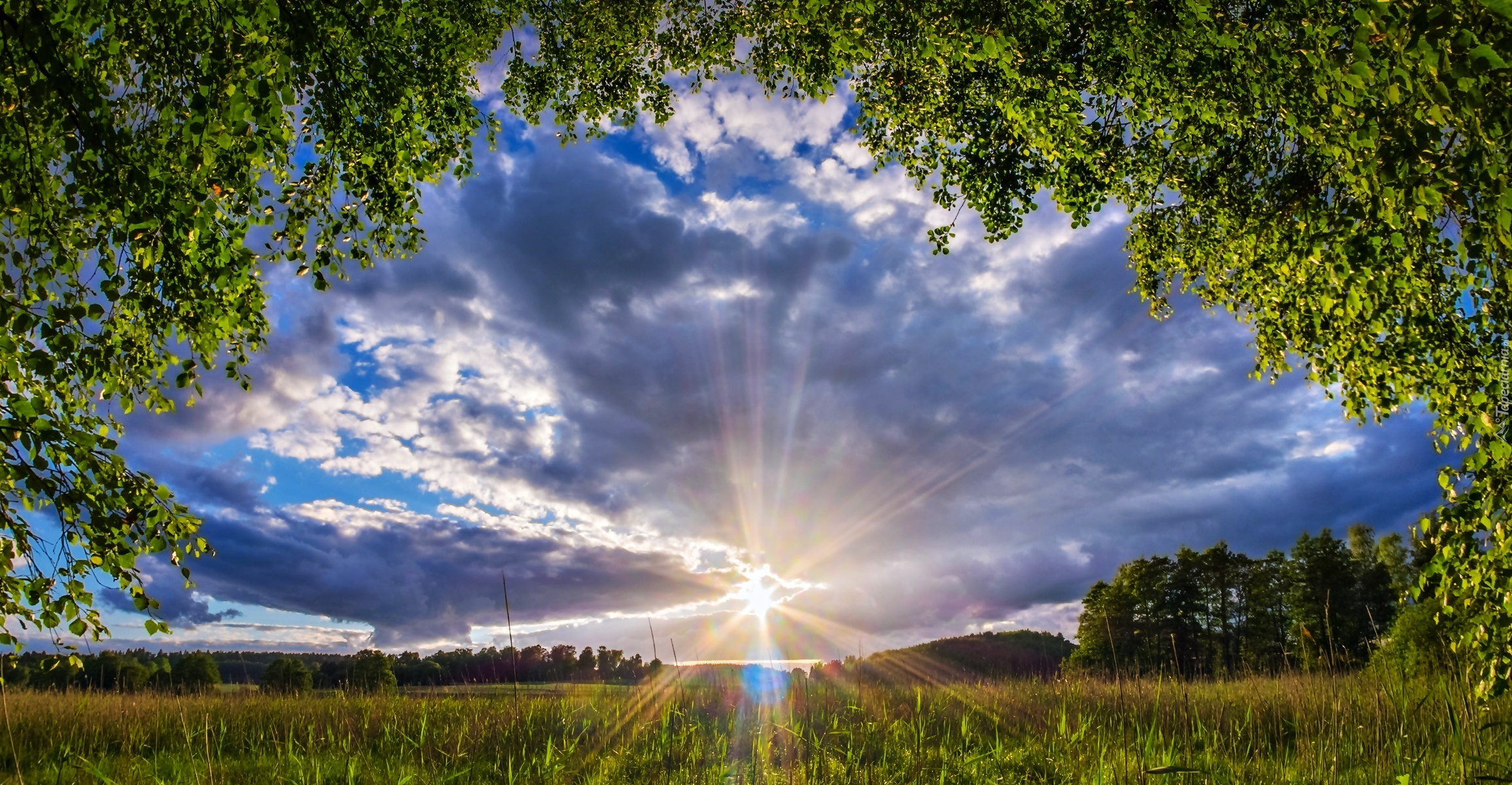 Edytor tapety: Wschód Słońca, Niebo, Łąka, Drzewa