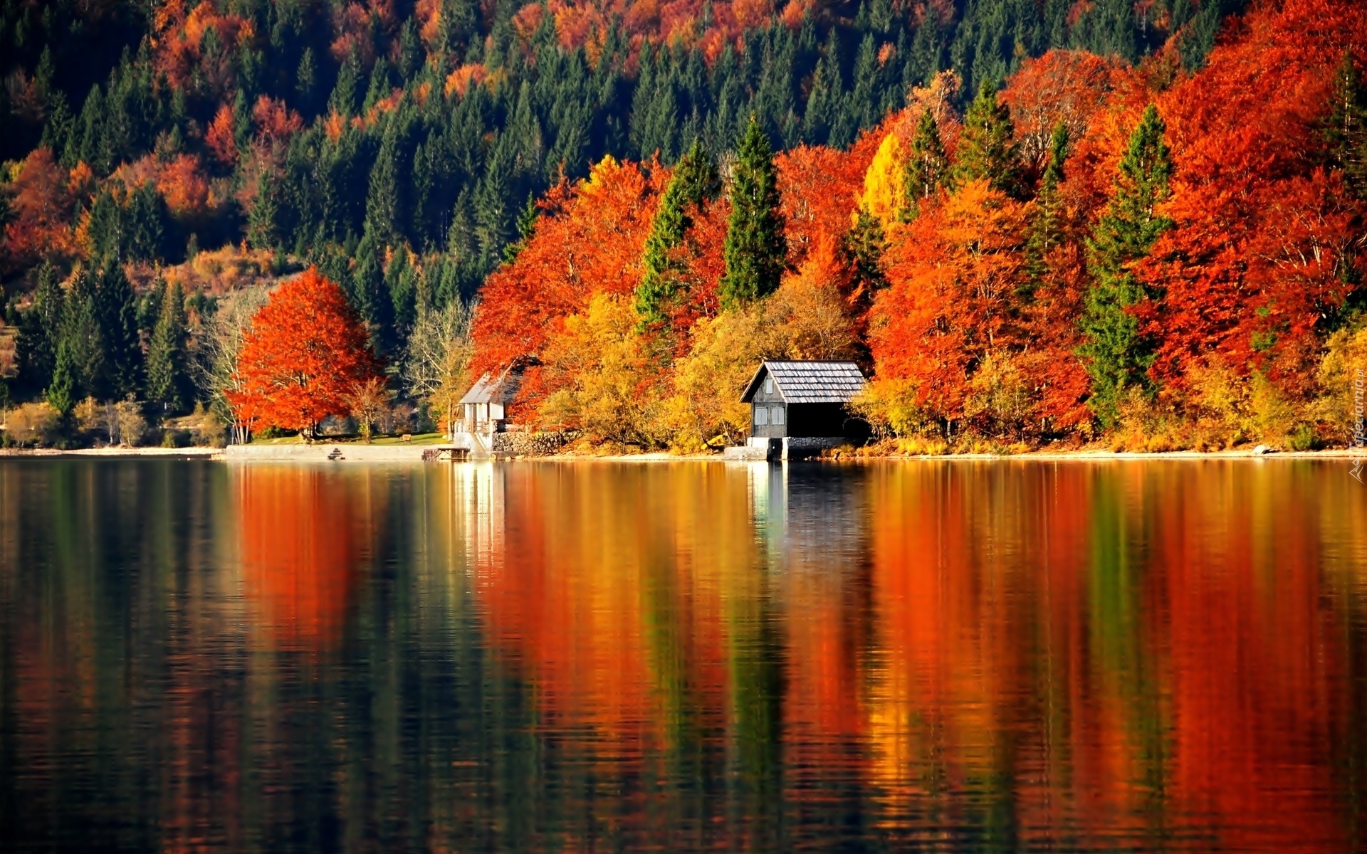 Edytor tapety: Jesień, Las, Jezioro, Domek, Odbicie