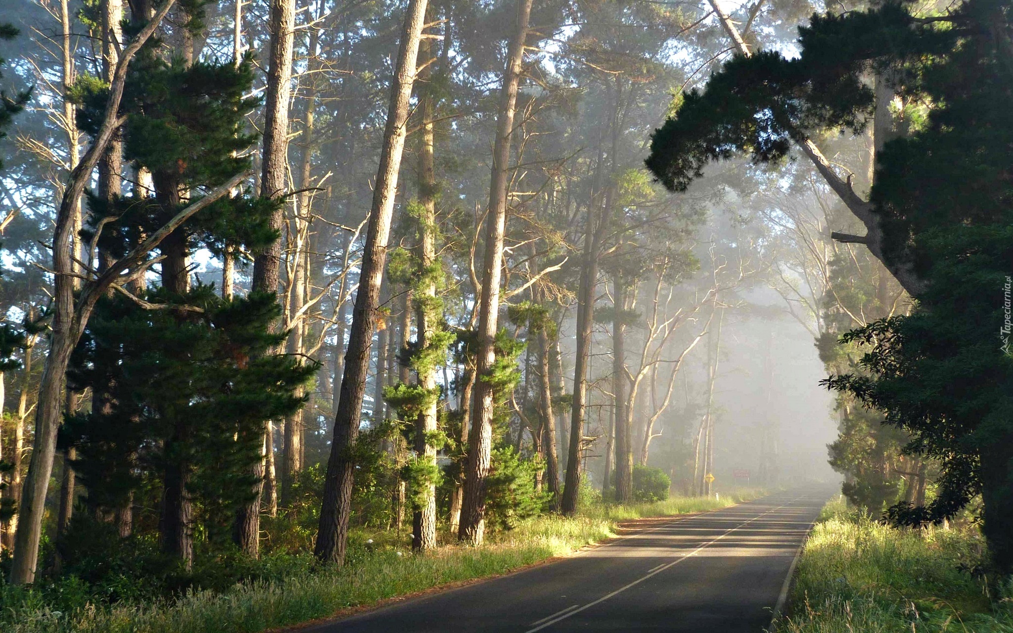 Edytor tapety: Droga, Las, Mgła, Poranek, Przebijające Światło