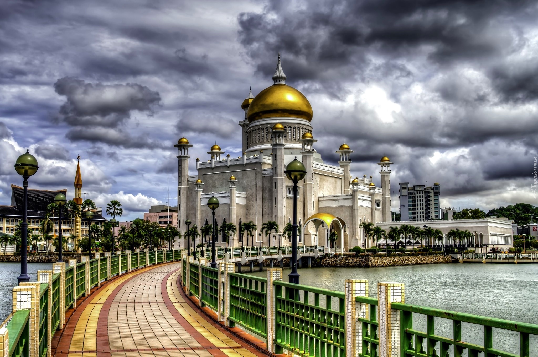 Edytor tapety: Meczet Sultan Mosque Omar Ali Saifuddin, Miasto Bandar Seri Begawan, Brunei, Azja, Most, Palmy, Lampy