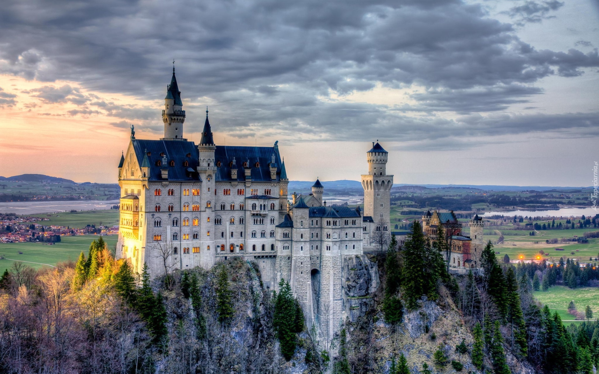 Edytor tapety: Niemcy, Bawaria, Zamek Neuschwanstein, Skały, Drzewa