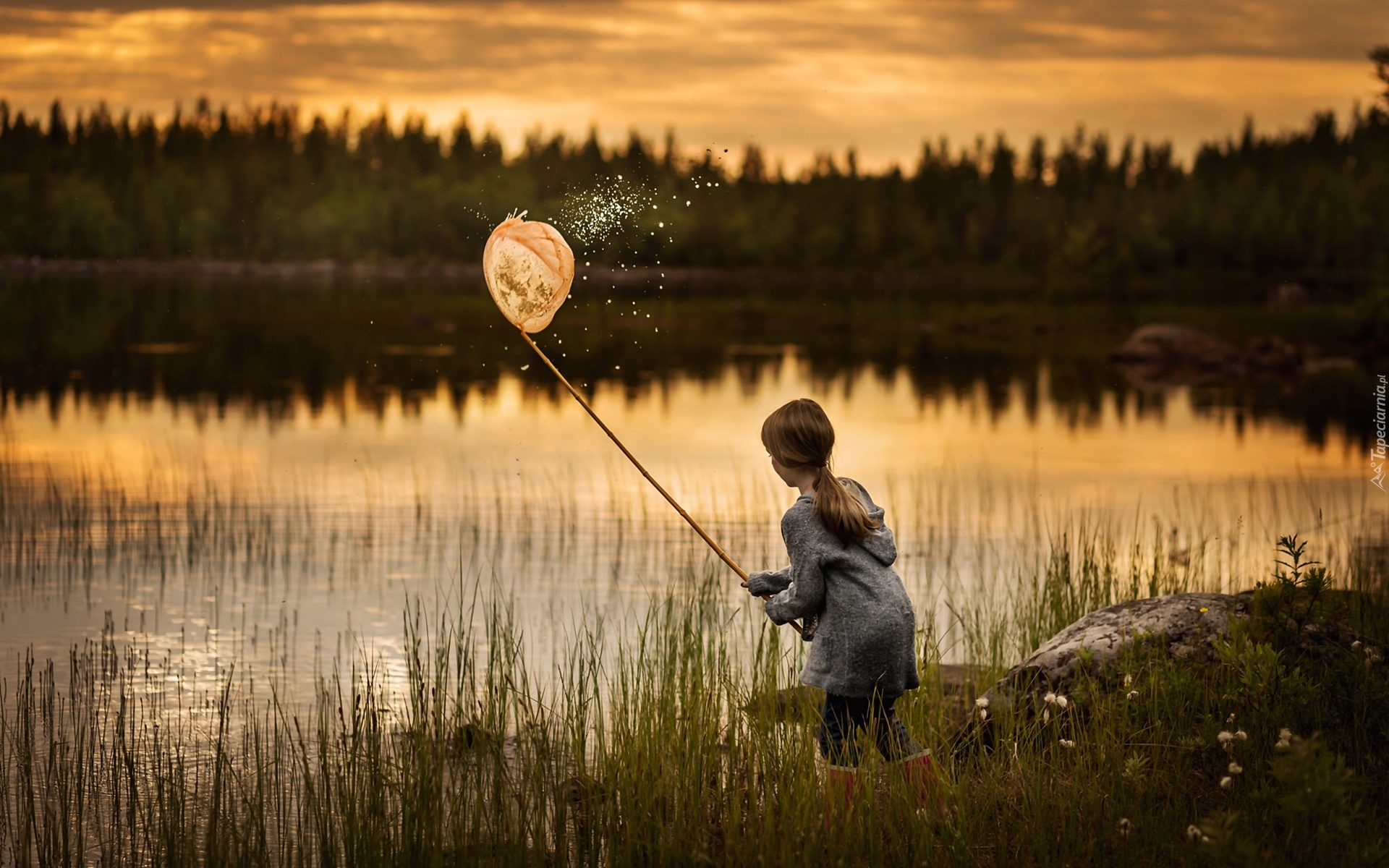 Edytor tapety: Dziewczynka, Jezioro, Las, Trawy