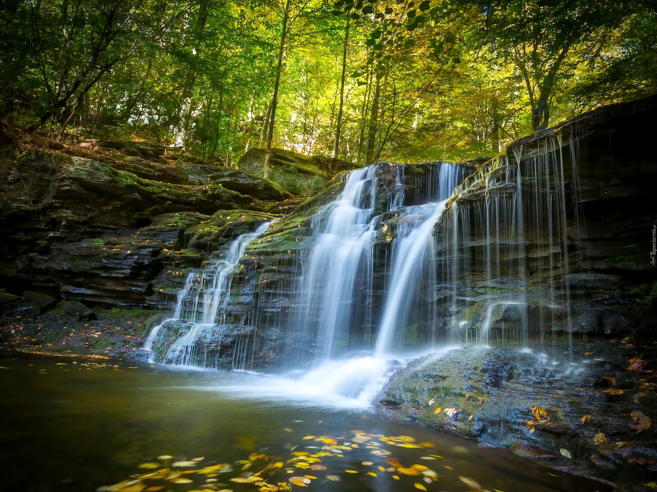 Edytor tapety: Wodospad, Las, Jeziorko, Jesień, Pensylwania