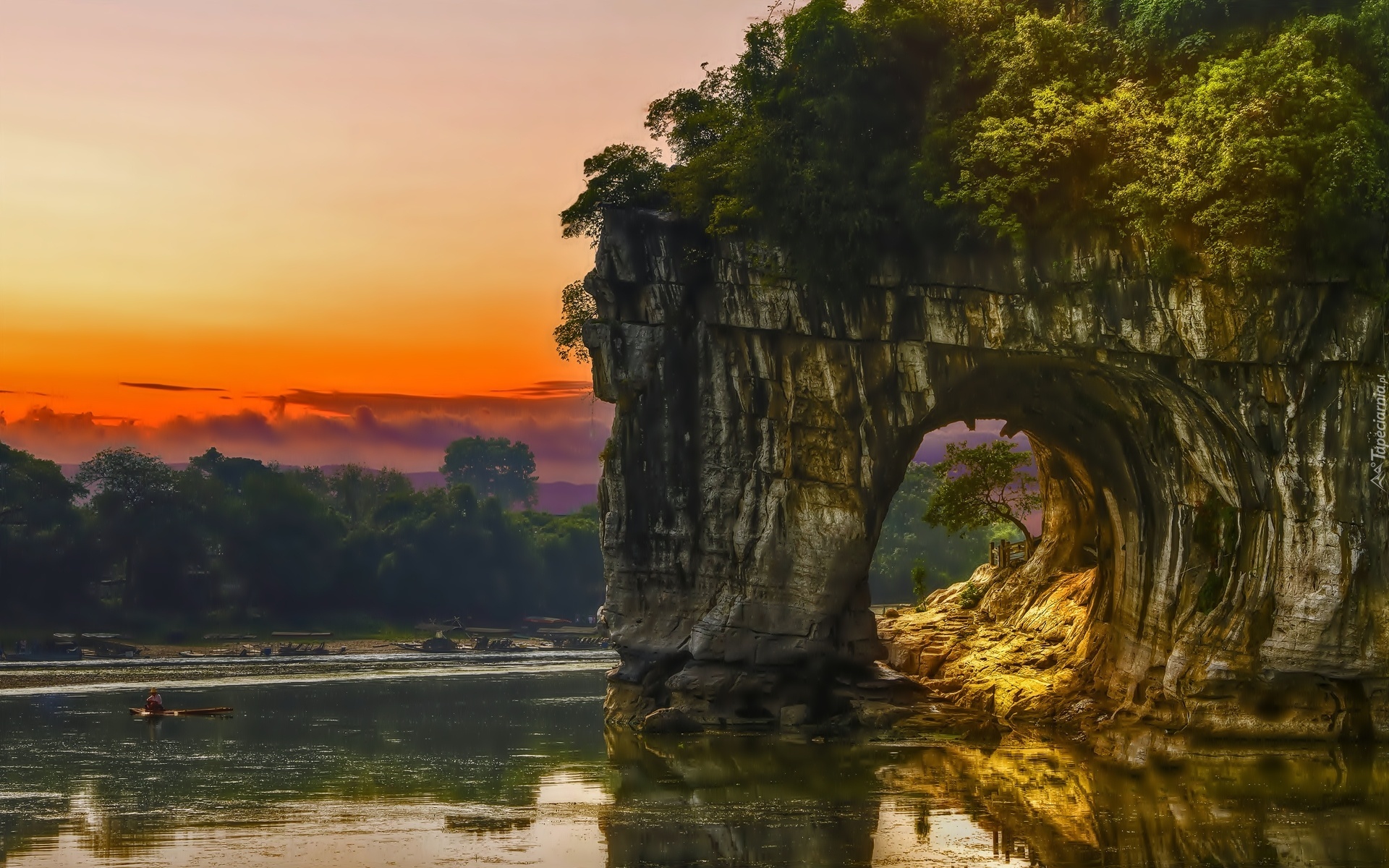Edytor tapety: Grota, Rzeka, Zachód Słońca, Skała