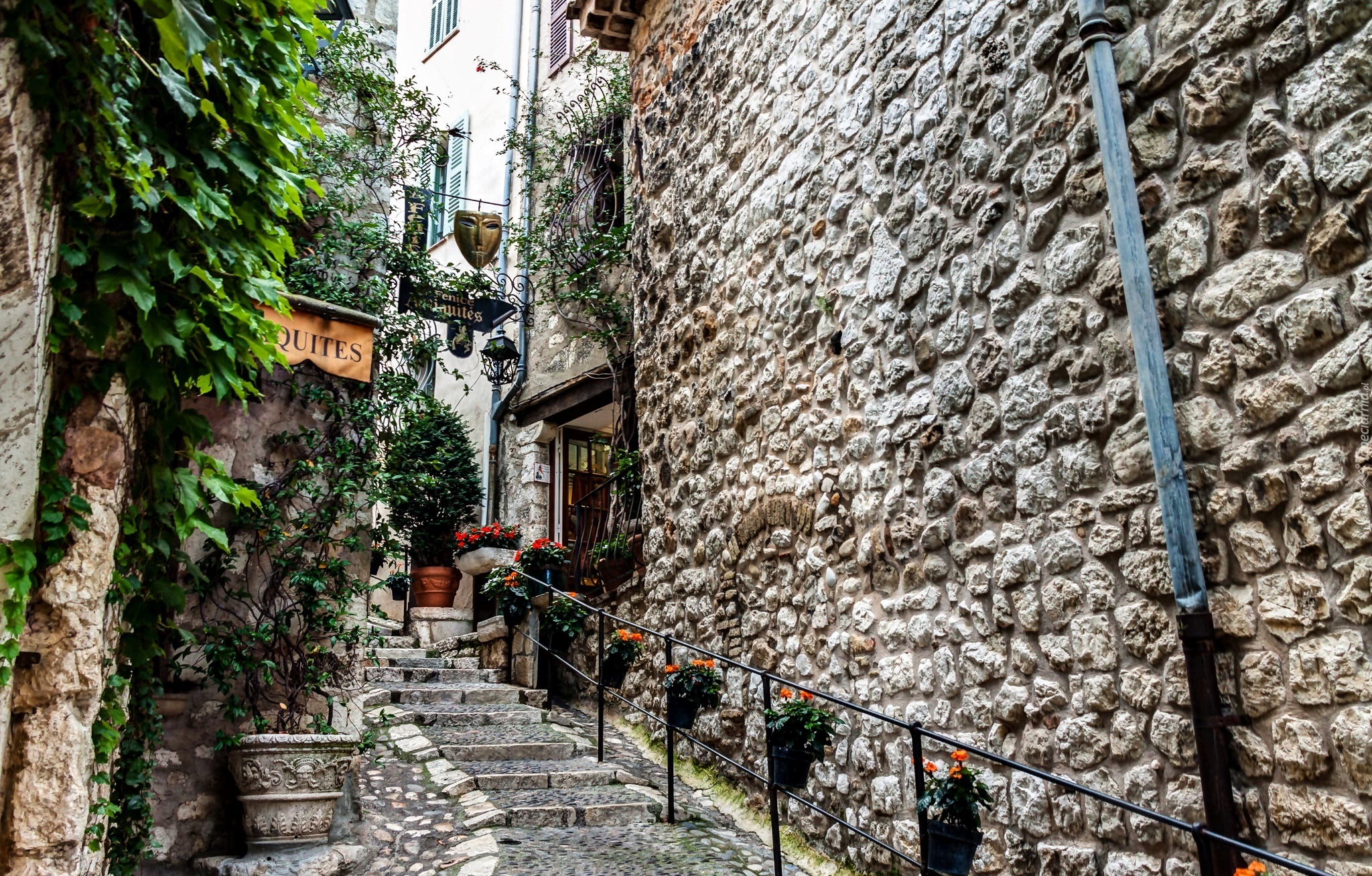 Edytor tapety: Saint-Paul-de-Vence, Lazurowe Wybrzeże, Francja, Schody, Szyldy, Kawiarnia