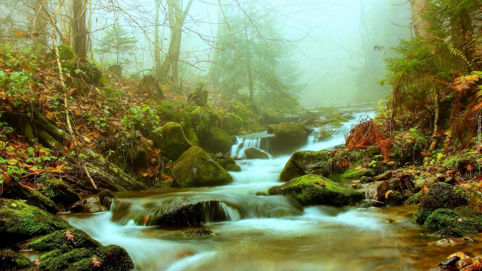 Edytor tapety: Jesienny, Las, Potok, Kamienie, Mgła