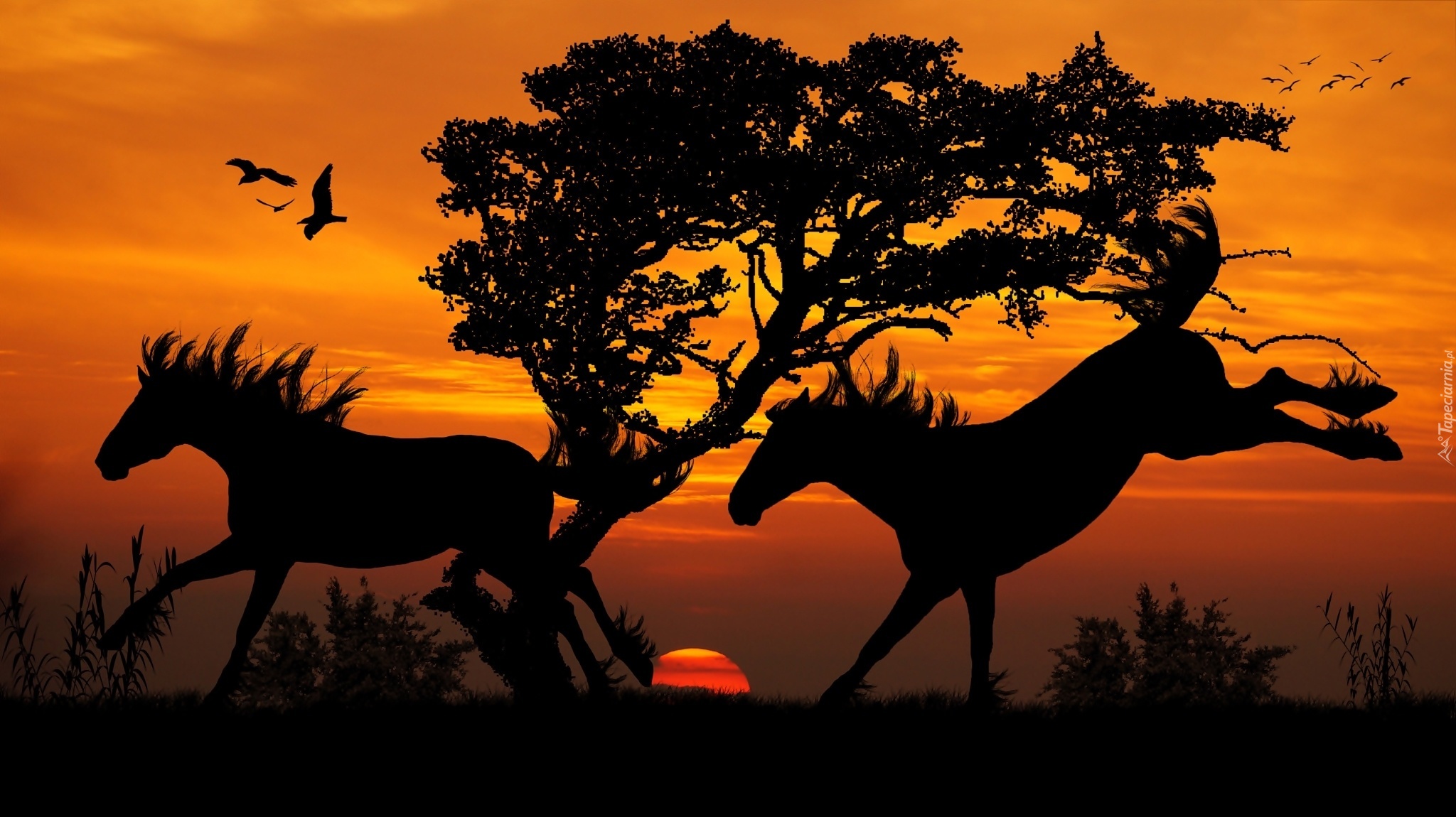 Edytor tapety: Konie, Drzewa, Ptaki, Piękny, Zachód, Słońca